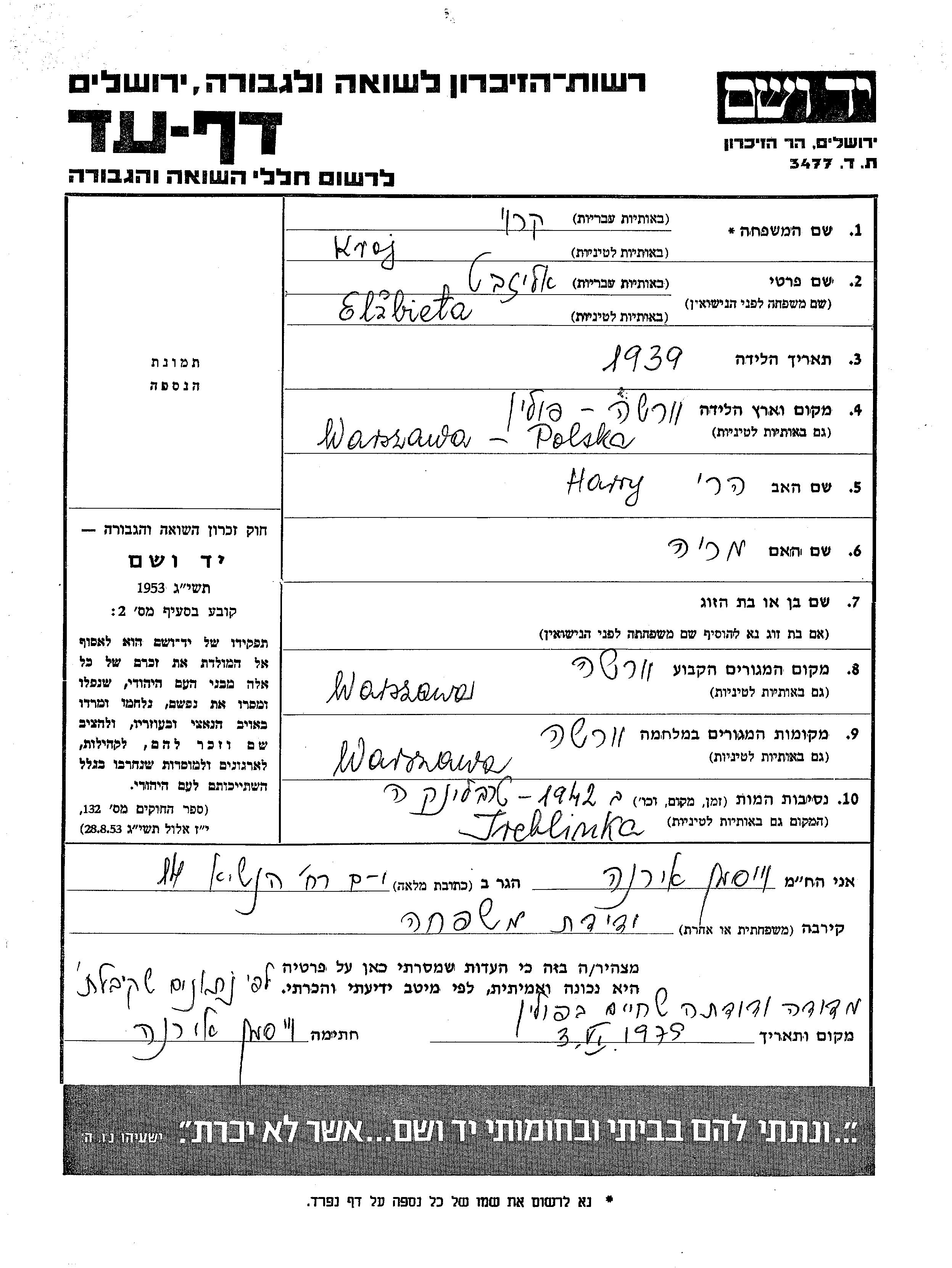 Эльжбета Крой, место рождения: Варшава, Польша. Отец: Харри, mать:Мария. Место жительства до войны: Варшава, Польша. Место во время войны: Варшава, Польша.