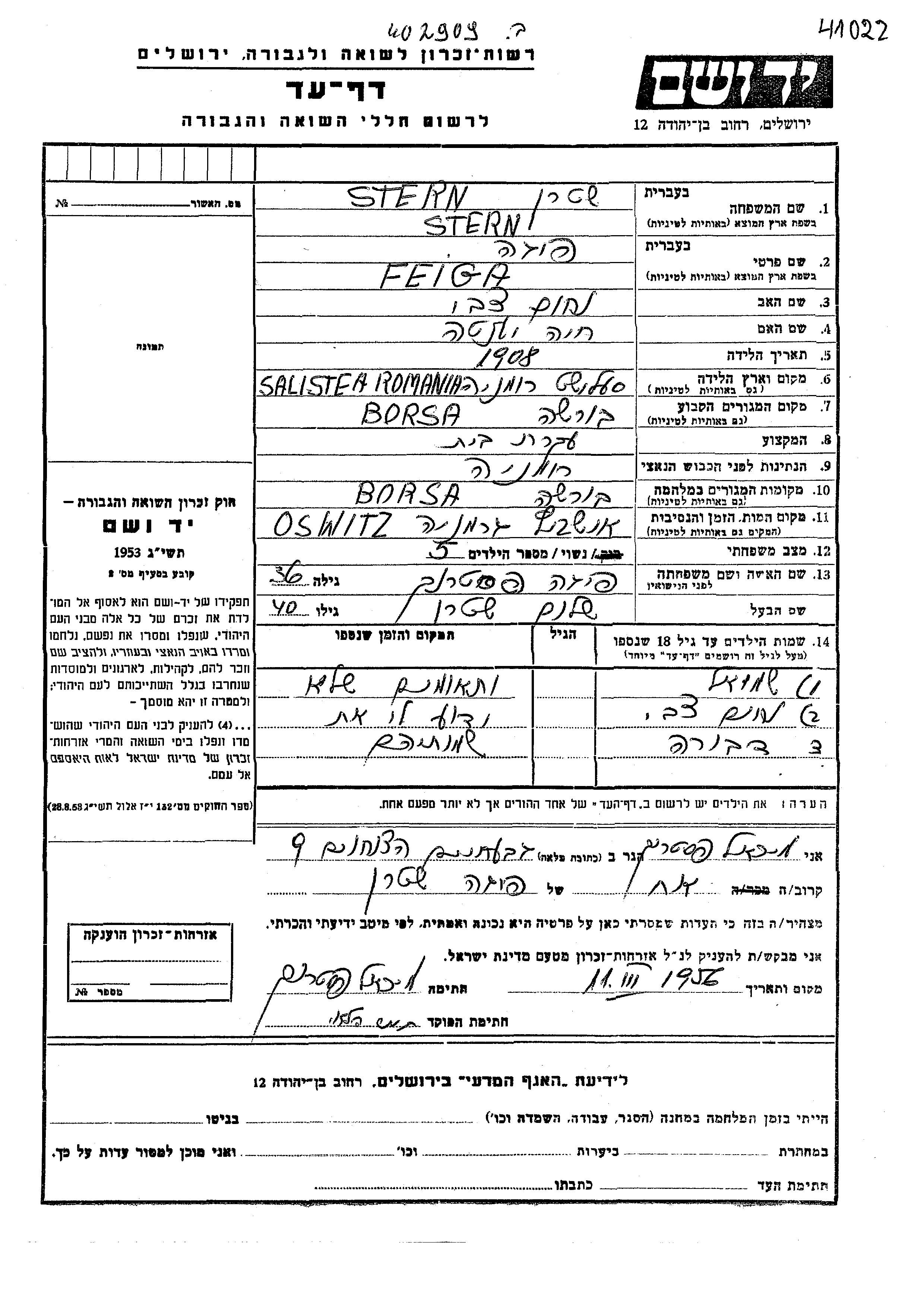Штерн Нахум Цви Борса, Румыния Лист свидетельских показаний