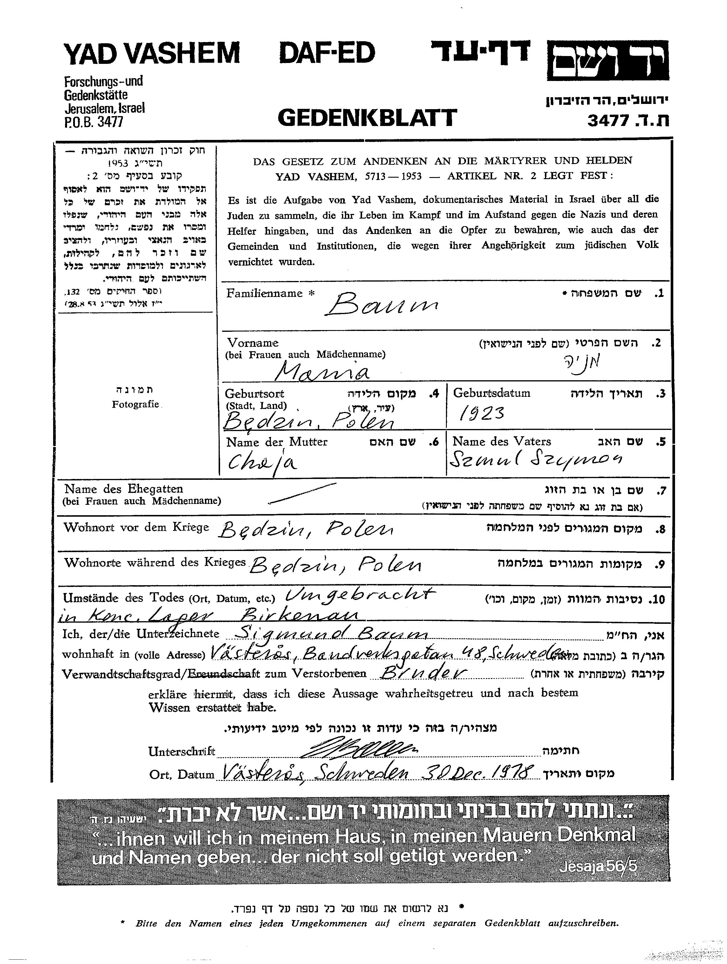 Баум | Маня | 1923 | Бендзин, Польша | Лист свидетельских показаний |