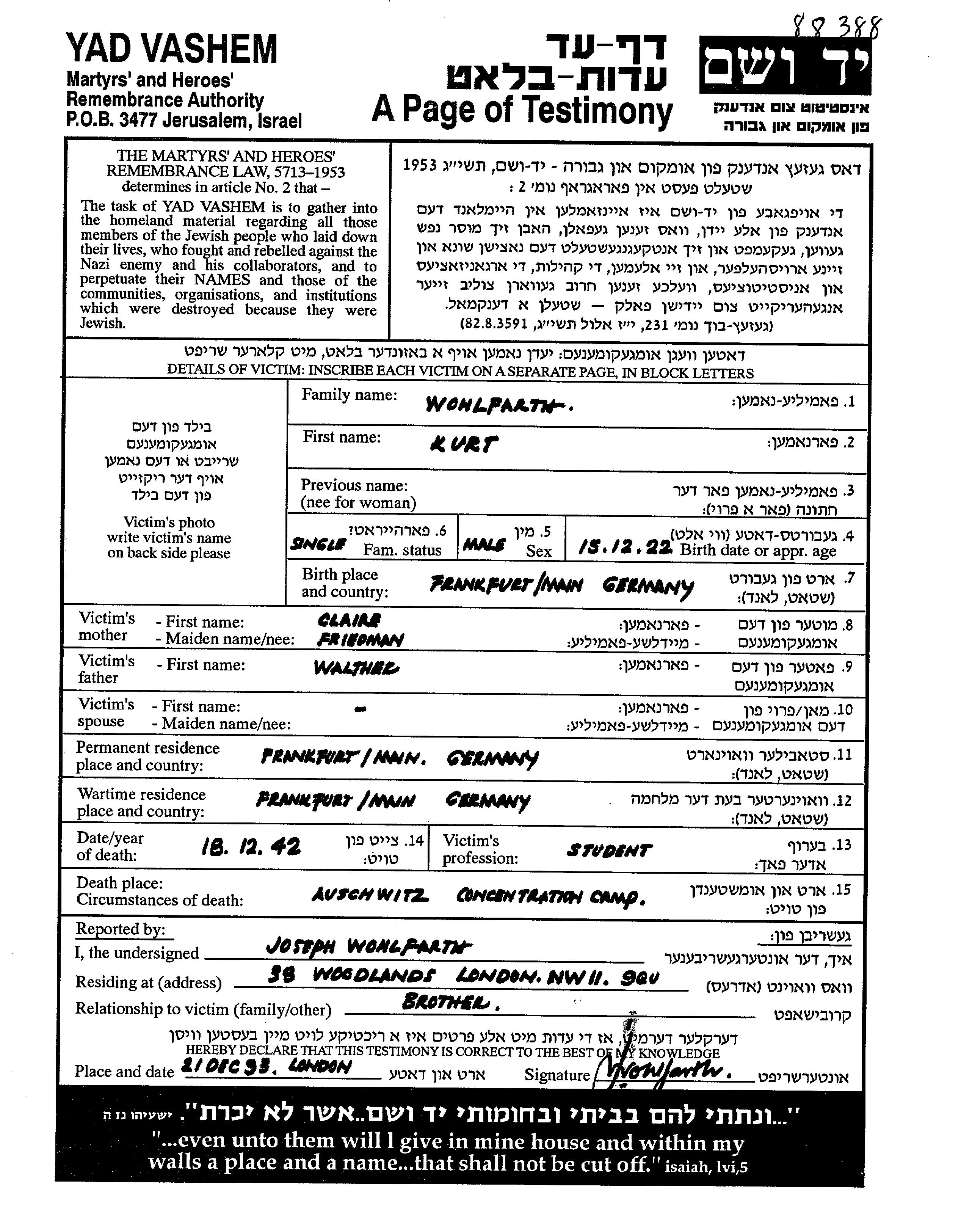 Курт уничтожен в период Шоа. место смерти: Аушвиц, Польша в 18/12/1942.