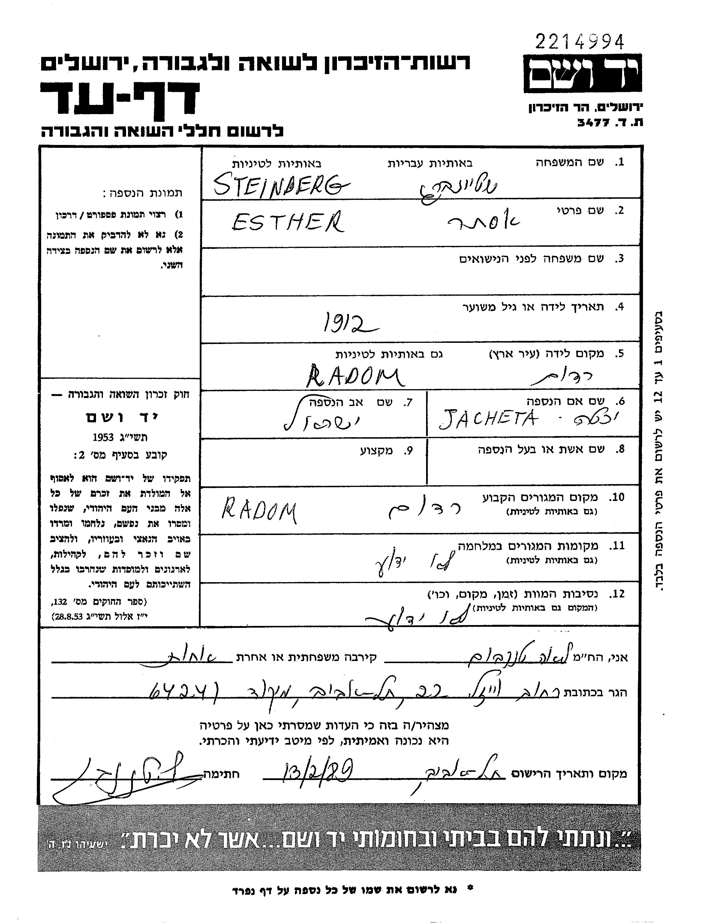 Штайнберг Эстера 1918 Радом, Польша Лист свидетельских показаний
