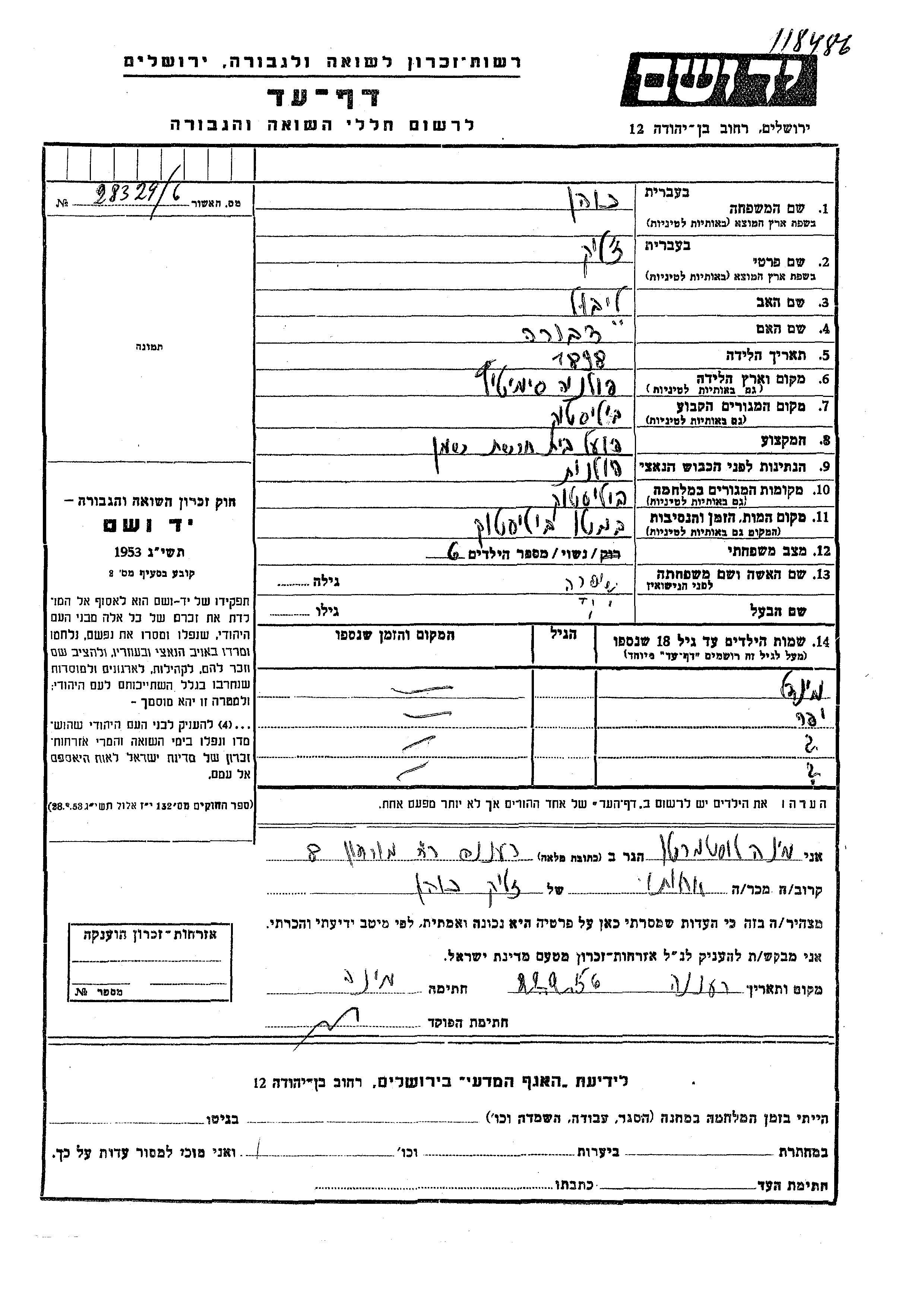Коэн | Яфа | Белосток, Польша | Лист свидетельских показаний | |