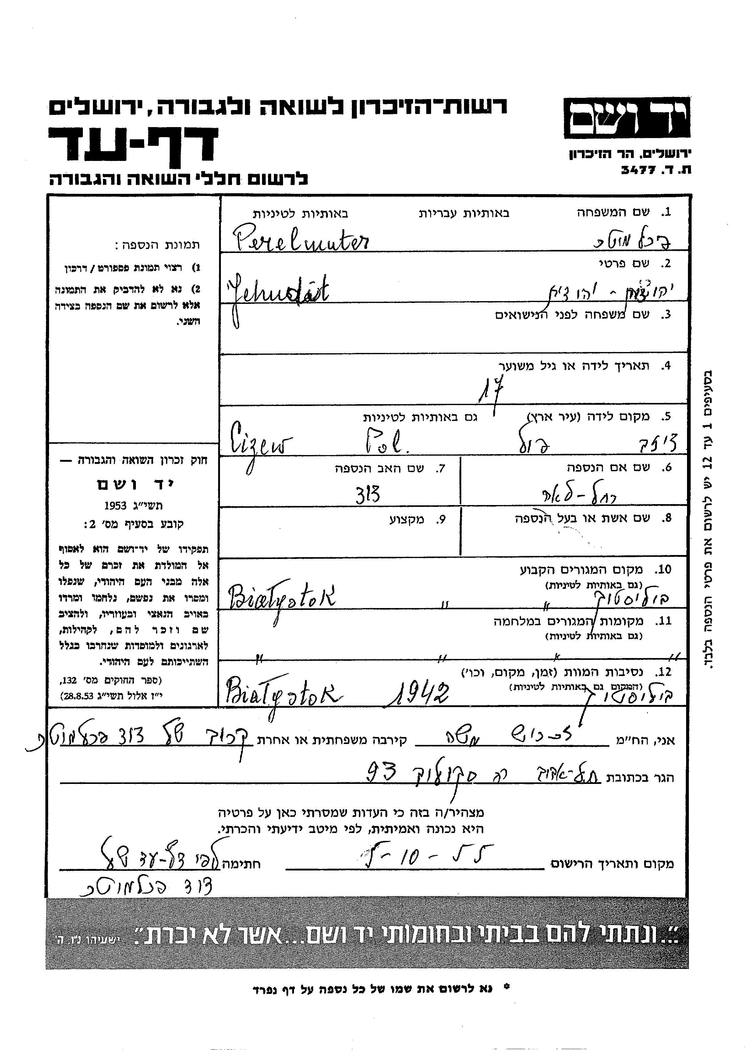 | Перельмутер | Иегудит | Белосток, Польша | Лист свидетельских показаний |
