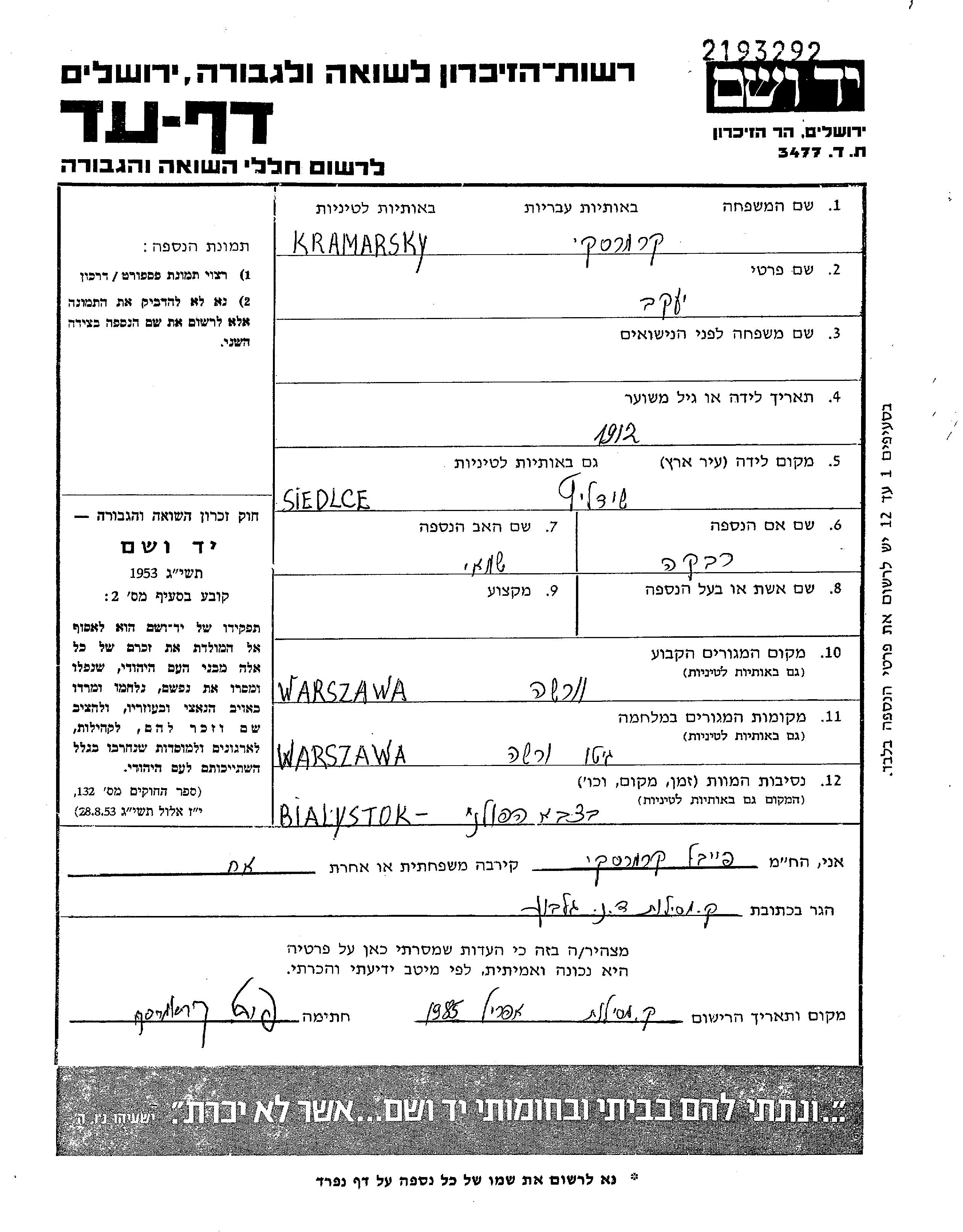 Крамарски Якуб 1913 Варшава, Польша Лист свидетельских показаний