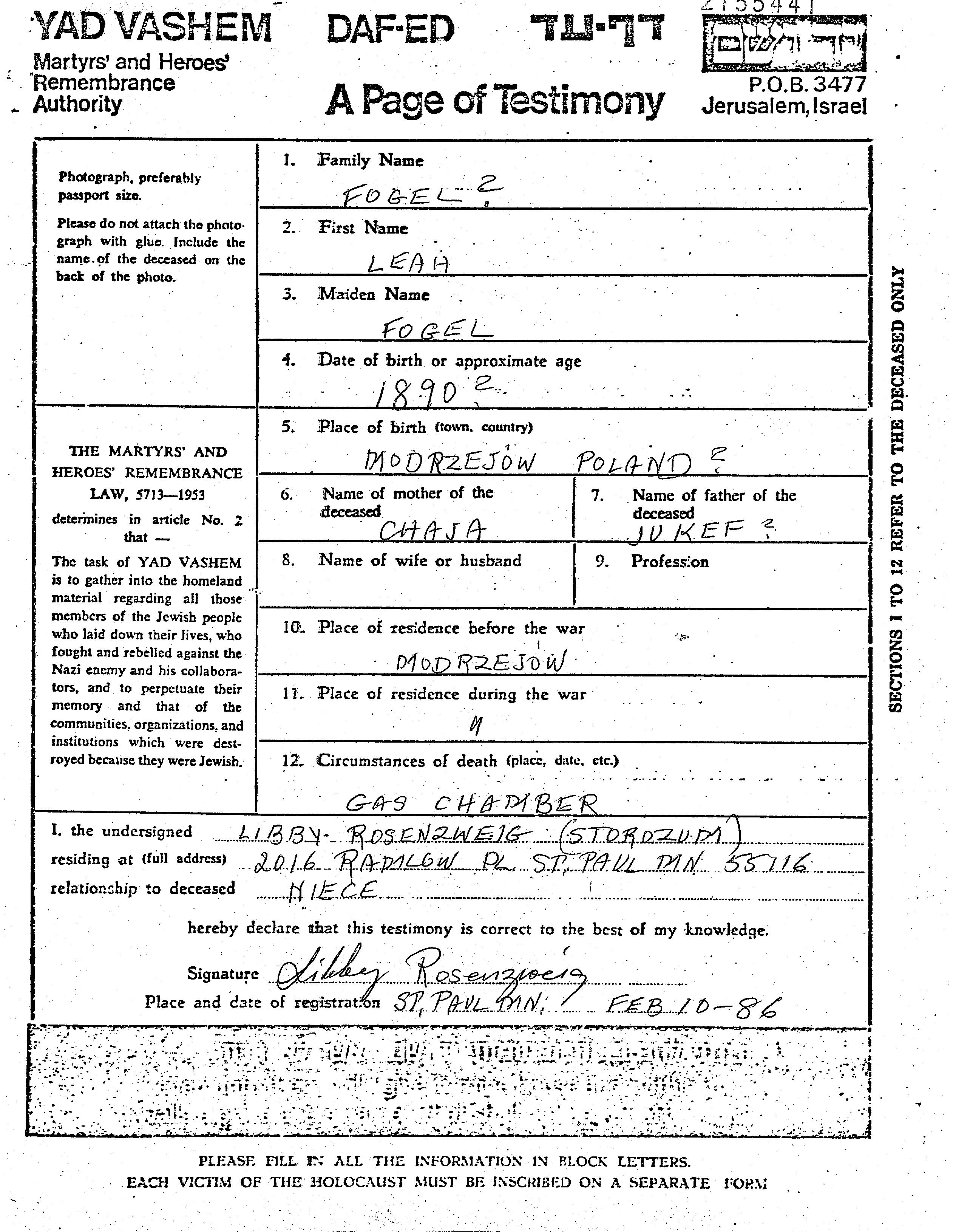 Фогель Лая Моджеюв, Польша Лист свидетельских показаний