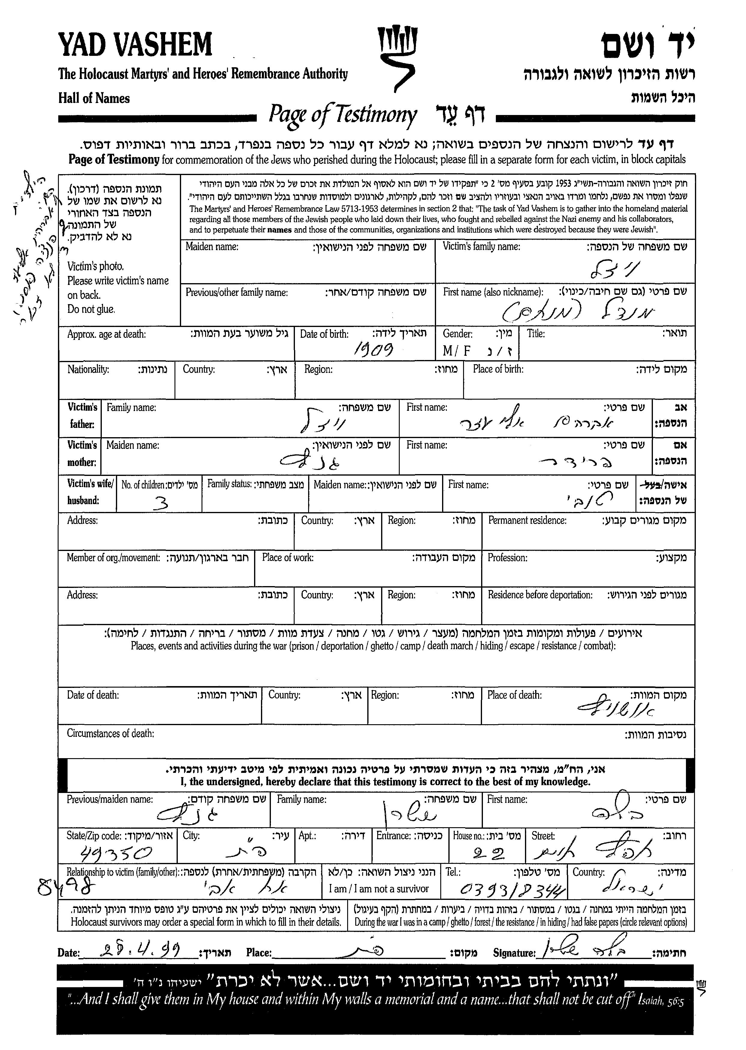 Визель Мендель 1903 Стругурень, Румыния Лист свидетельских показаний