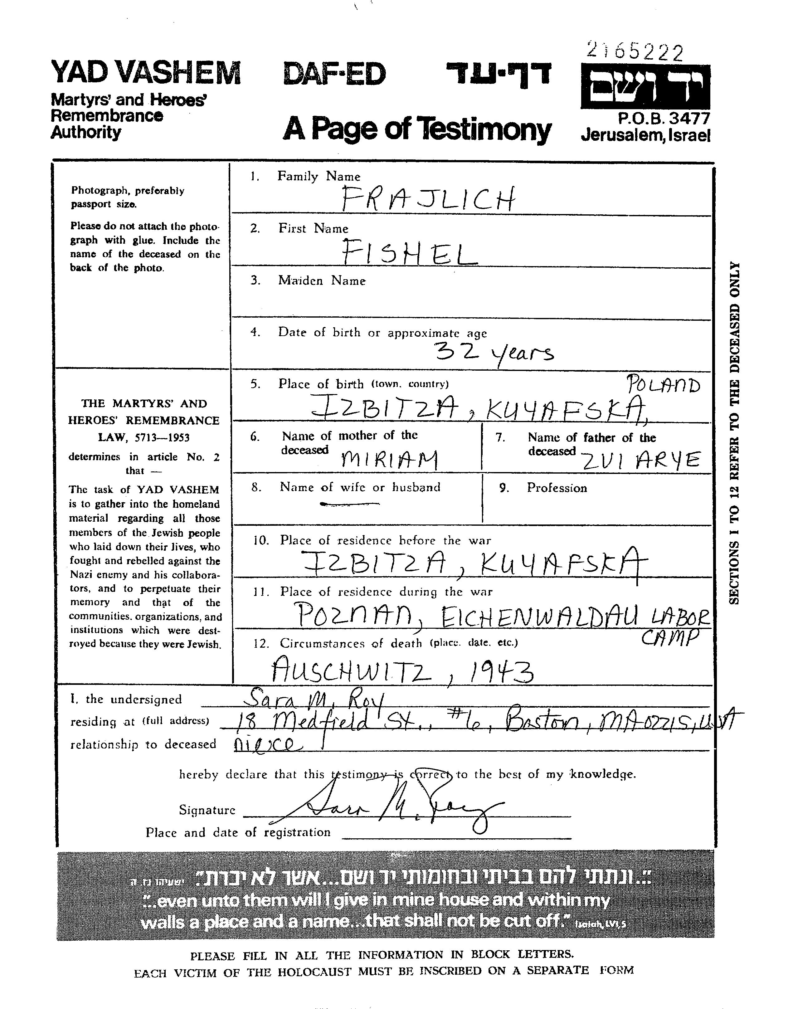 Фрайлих Фишель Эфраим 1914 Избица-Куявска, Польша Лист свидетельских показаний