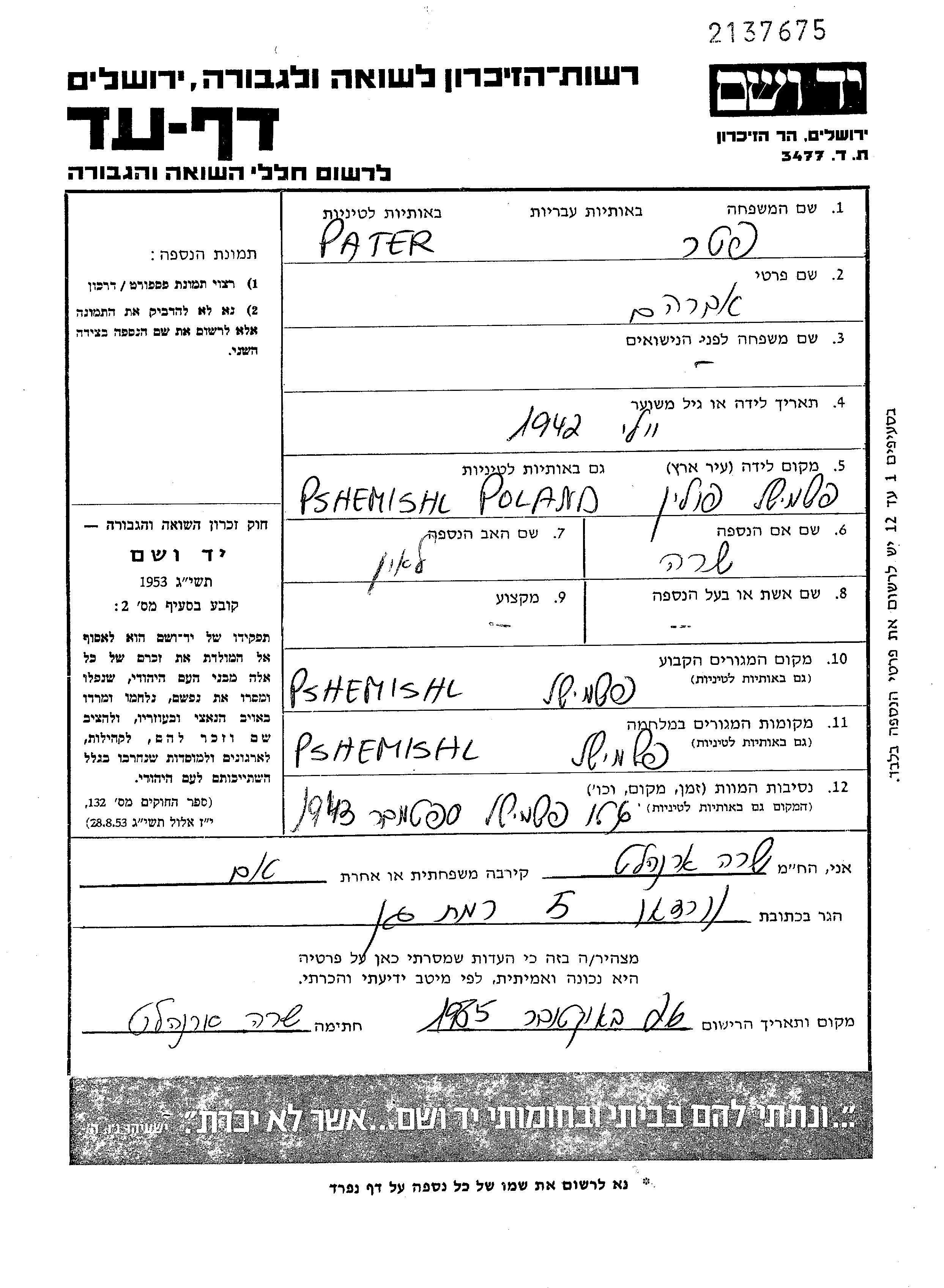Авраам Паттер, место рождения: Пшемысль, Польша. Место жительства до войны: Пшемысль, Польша.