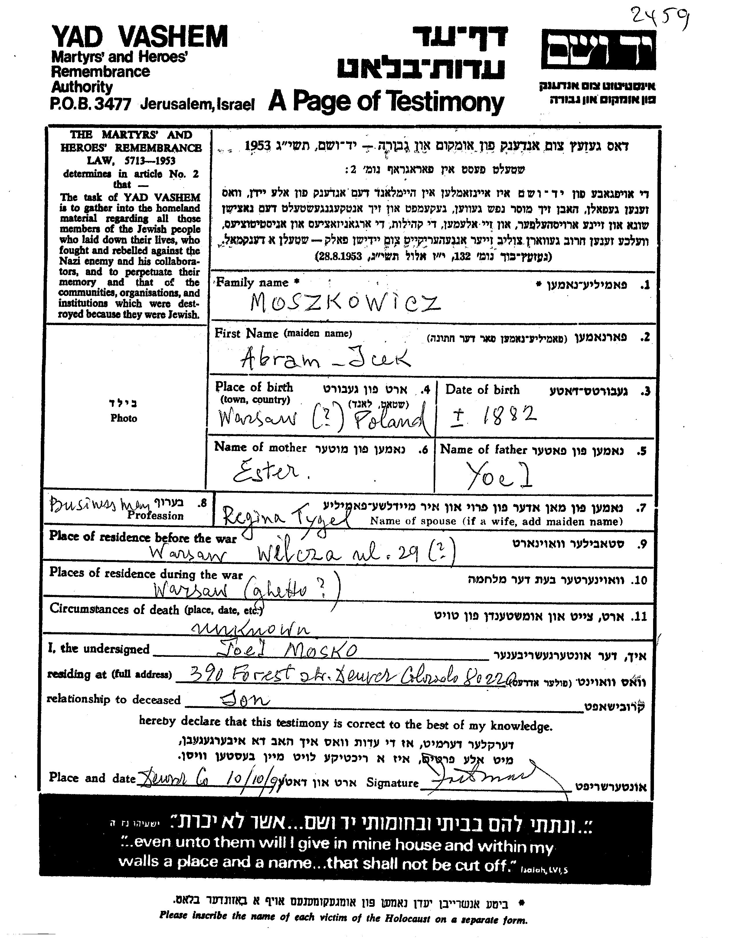 Мошкович | Абрам Ицек | 1882 | Варшава, Польша | Лист свидетельских показаний |