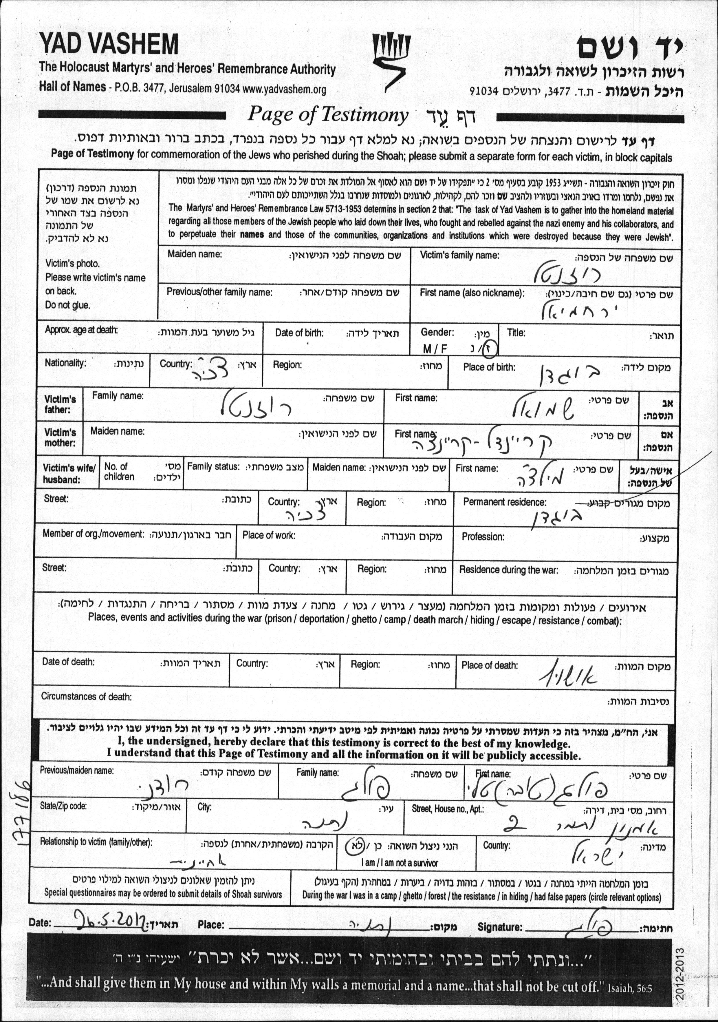 Розенталь | Режо Иерахмиэль | Богдан, Чехословакия | Лист свидетельских показаний |
