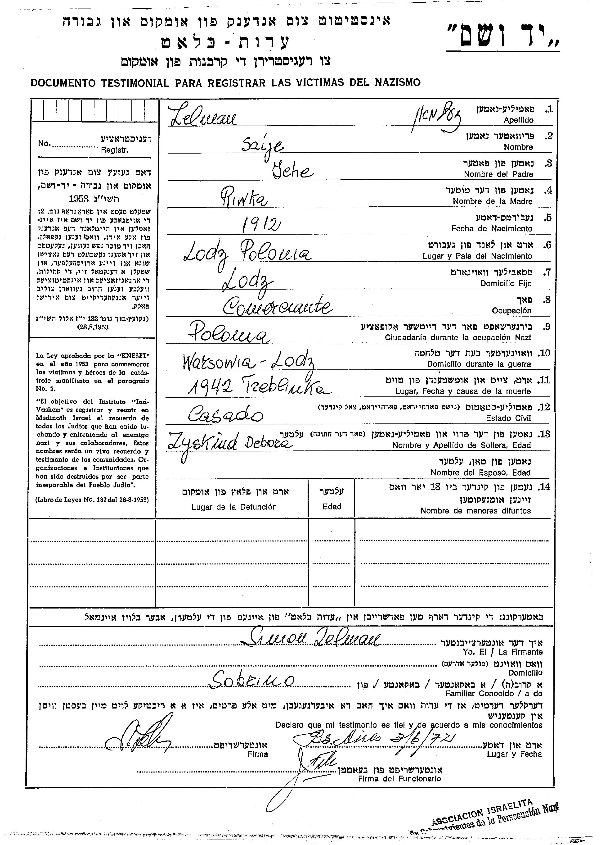 Зельман | Шие | 1912 | Лодзь, Польша | Лист свидетельских показаний |