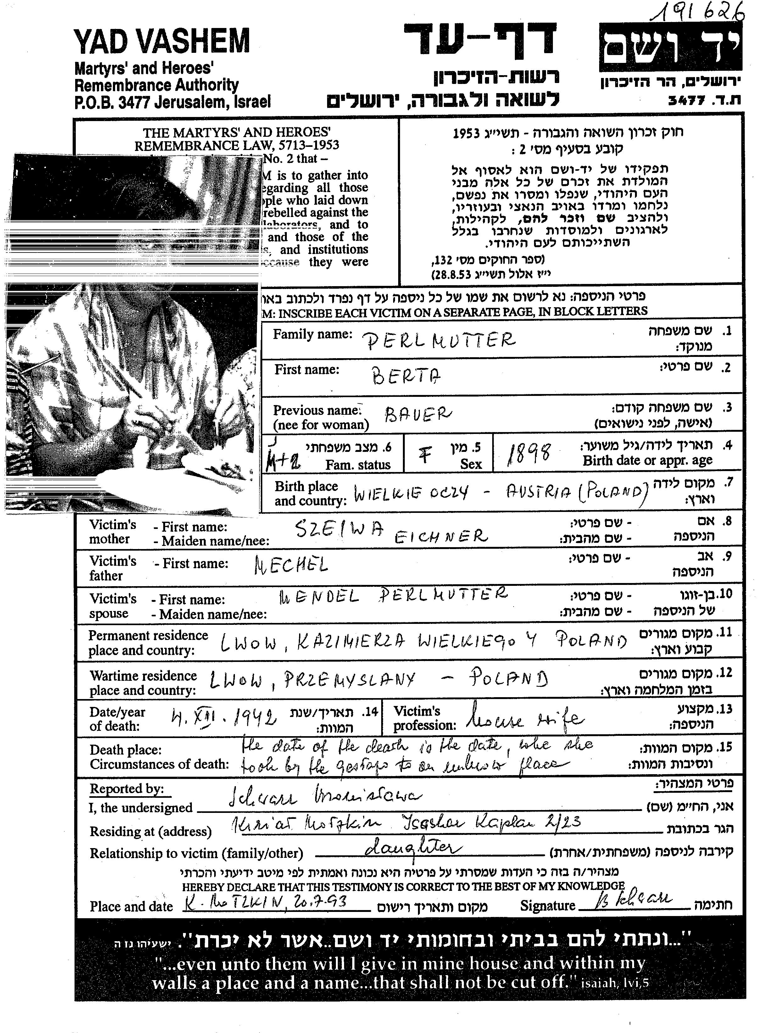 Перльмуттер Берта 1891 Львов, Польша Лист свидетельских показаний