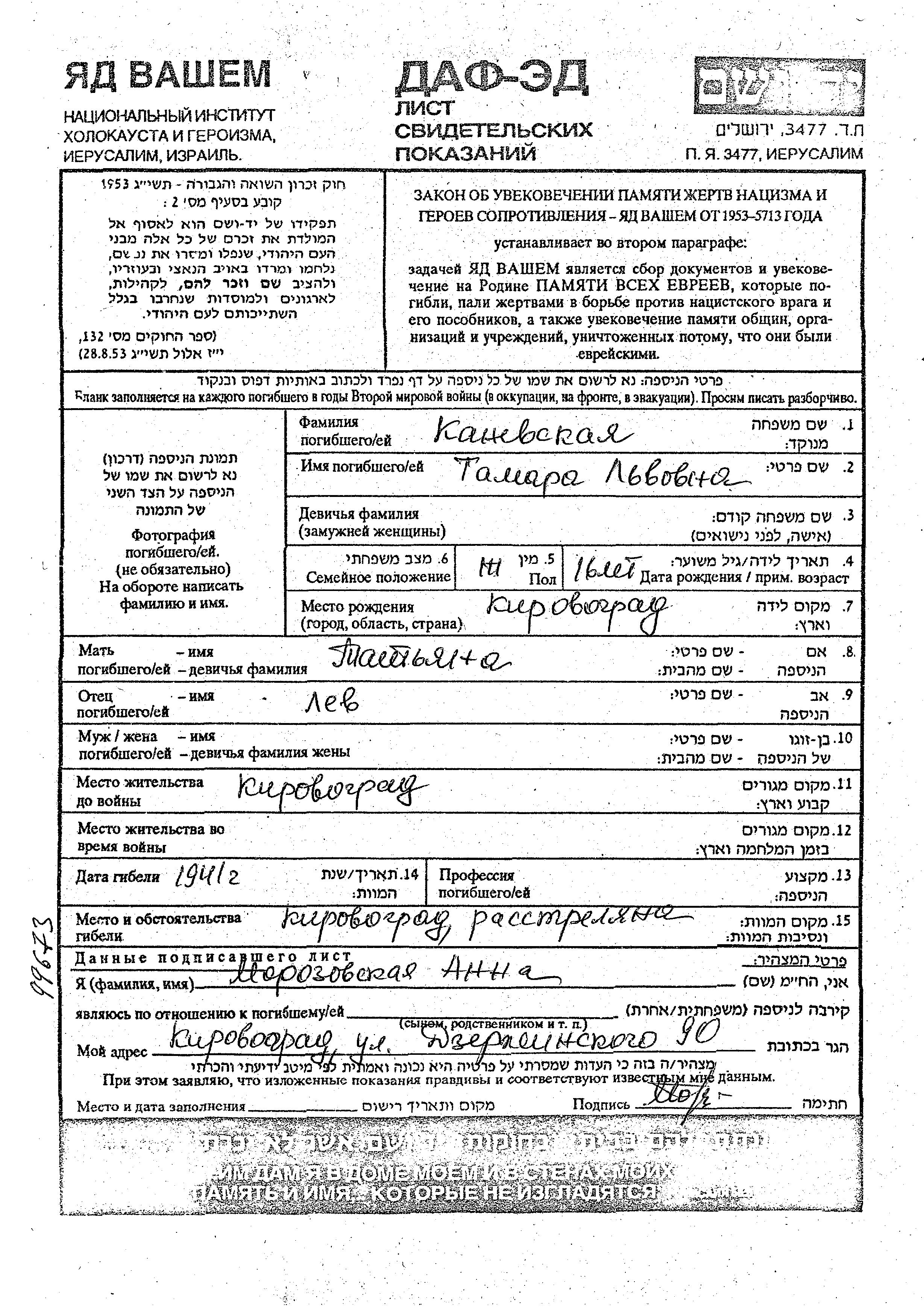 | Каневская | Тамара | Кировоград, Украина (СССР) | Лист свидетельских показаний | |