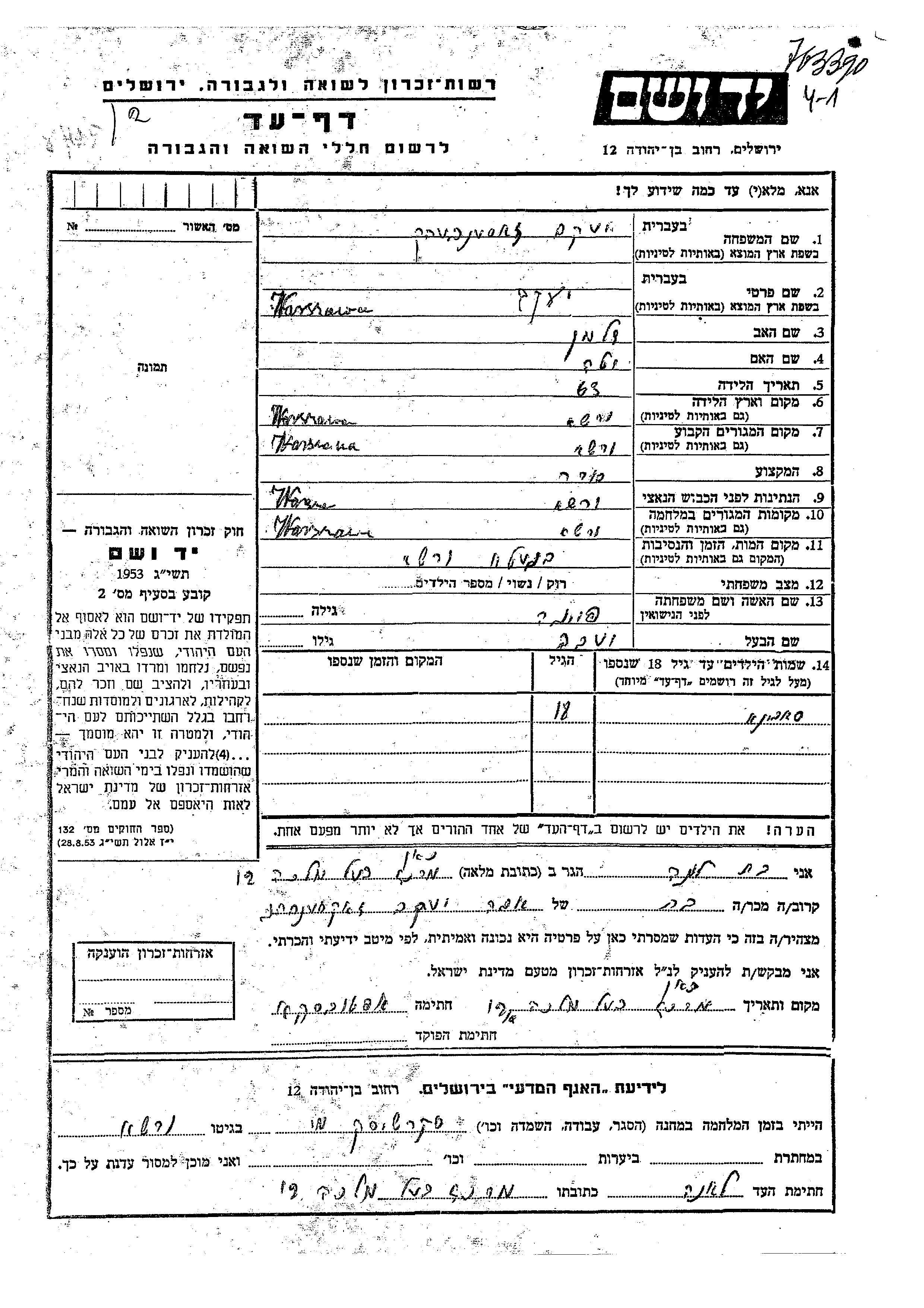 Заксенберг | Сабина | Варшава, Польша | Лист свидетельских показаний | |