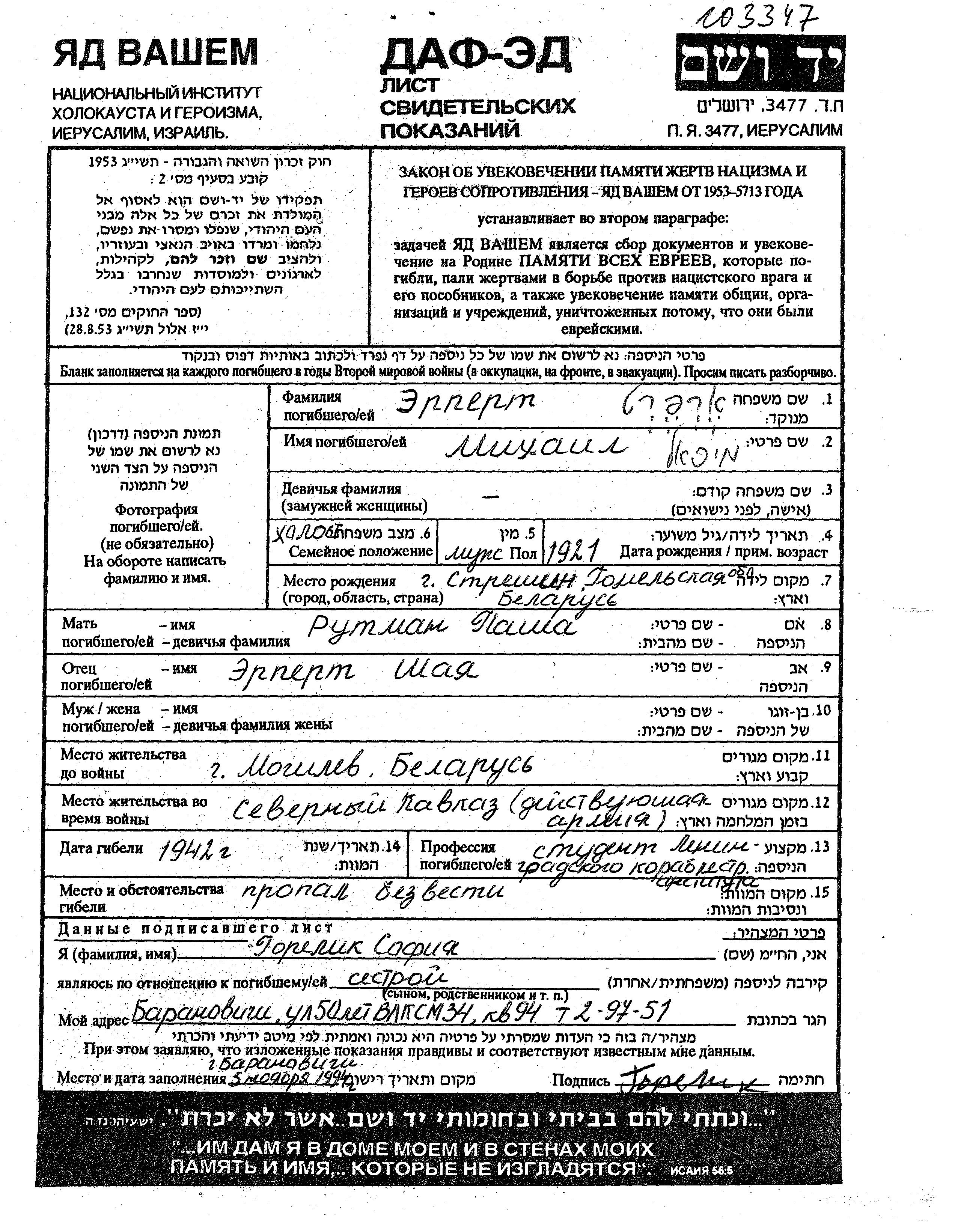 Эрперт Михаил 1921 Могилёв, Белоруссия (СССР) Лист свидетельских показаний