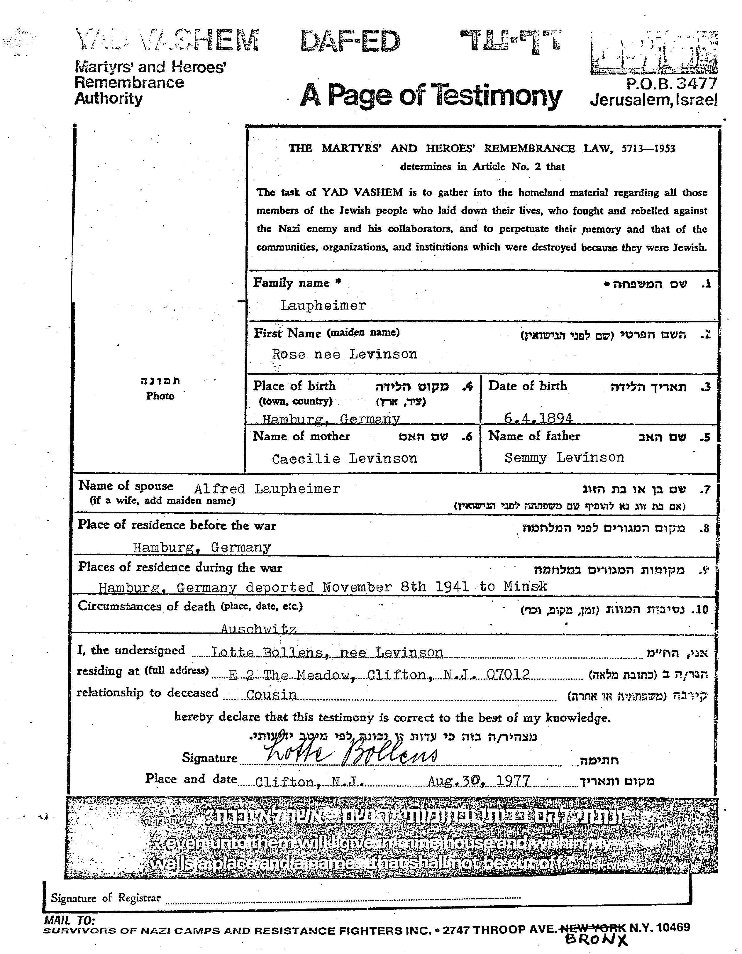 Розе Лаупхаймер, девичья фамилия Левинссон, место рождения: Гамбург, Германия. Домохозяйка. Место жительства до войны: Гамбург, Германия.