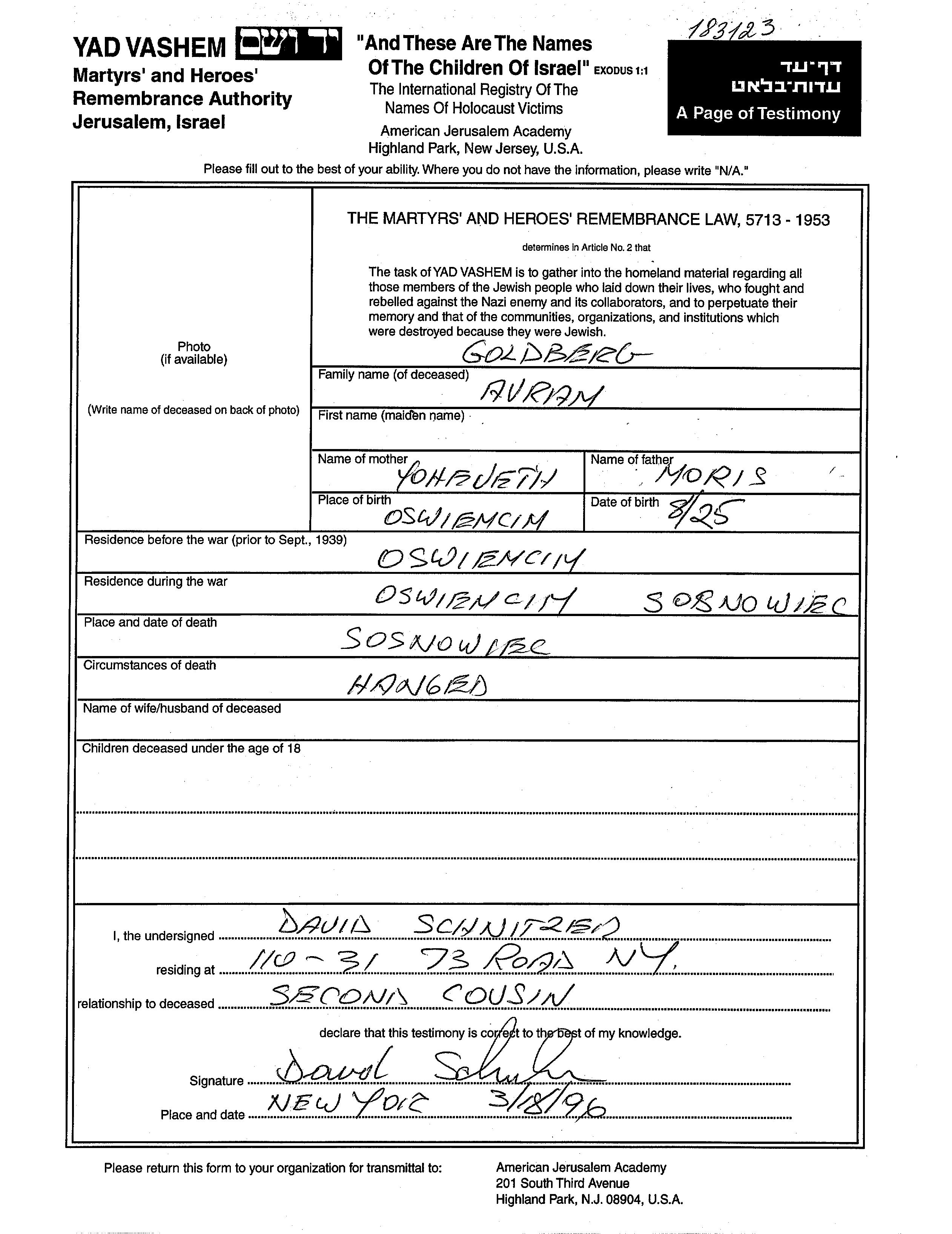 Гольдберг Авром 1924 Освенцим, Польша Лист свидетельских показаний (электронный)