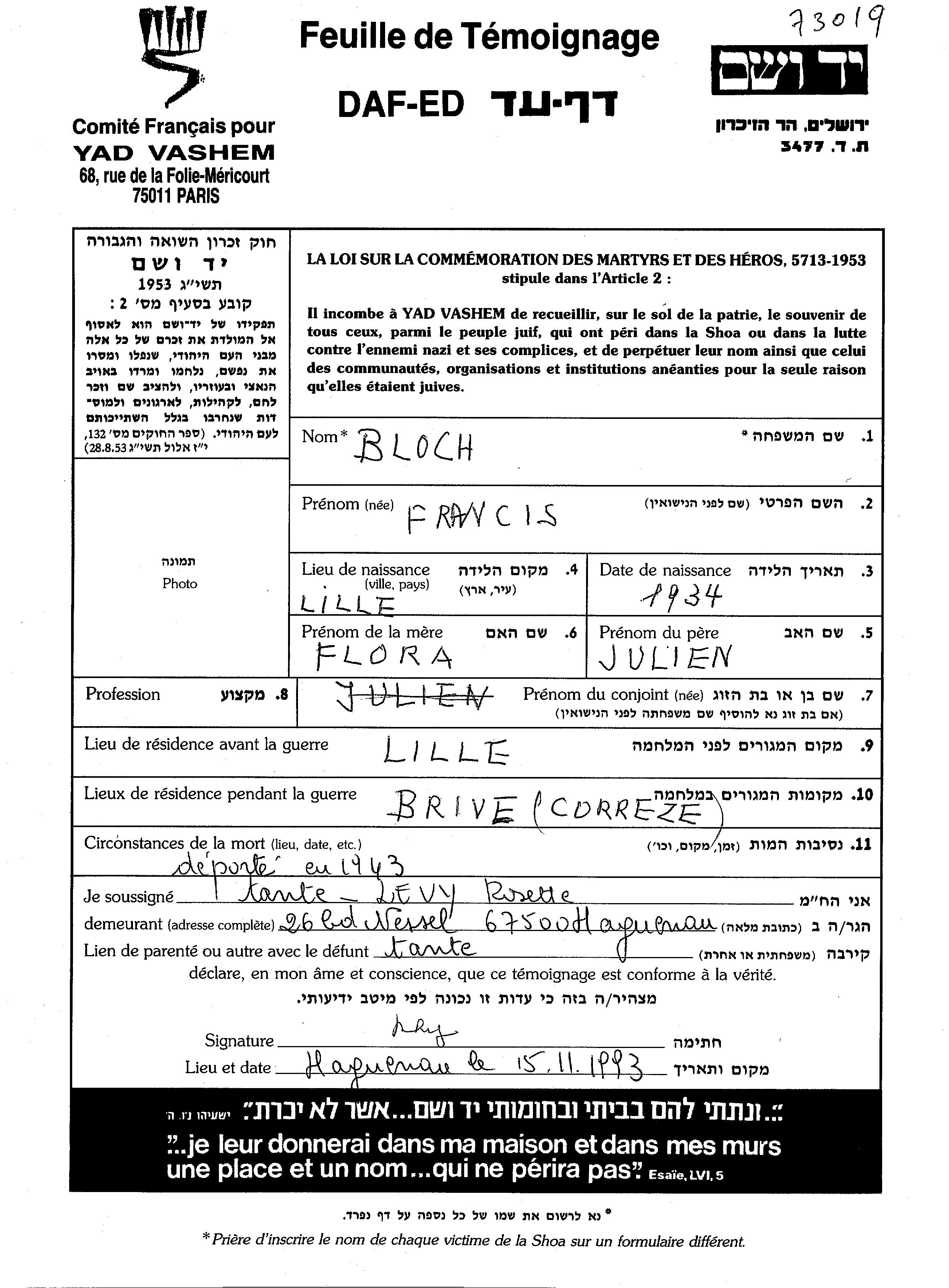Блох | Францис Александр Франсис | 1934 | Лилль, Франция | Лист свидетельских показаний |
