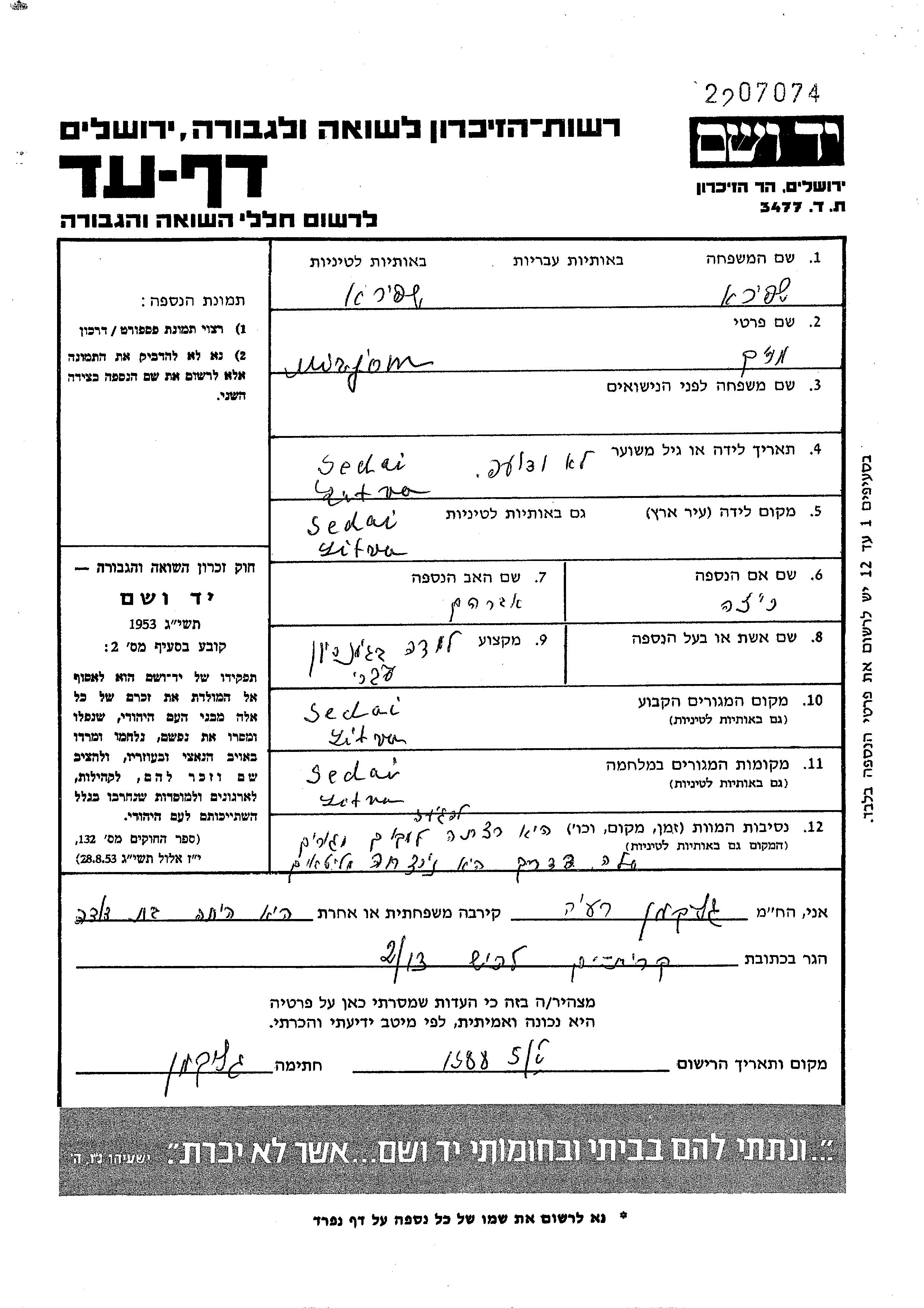 | Шапира | Гитл Мирьям | 1923 | Сод, Литва | Лист свидетельских показаний |