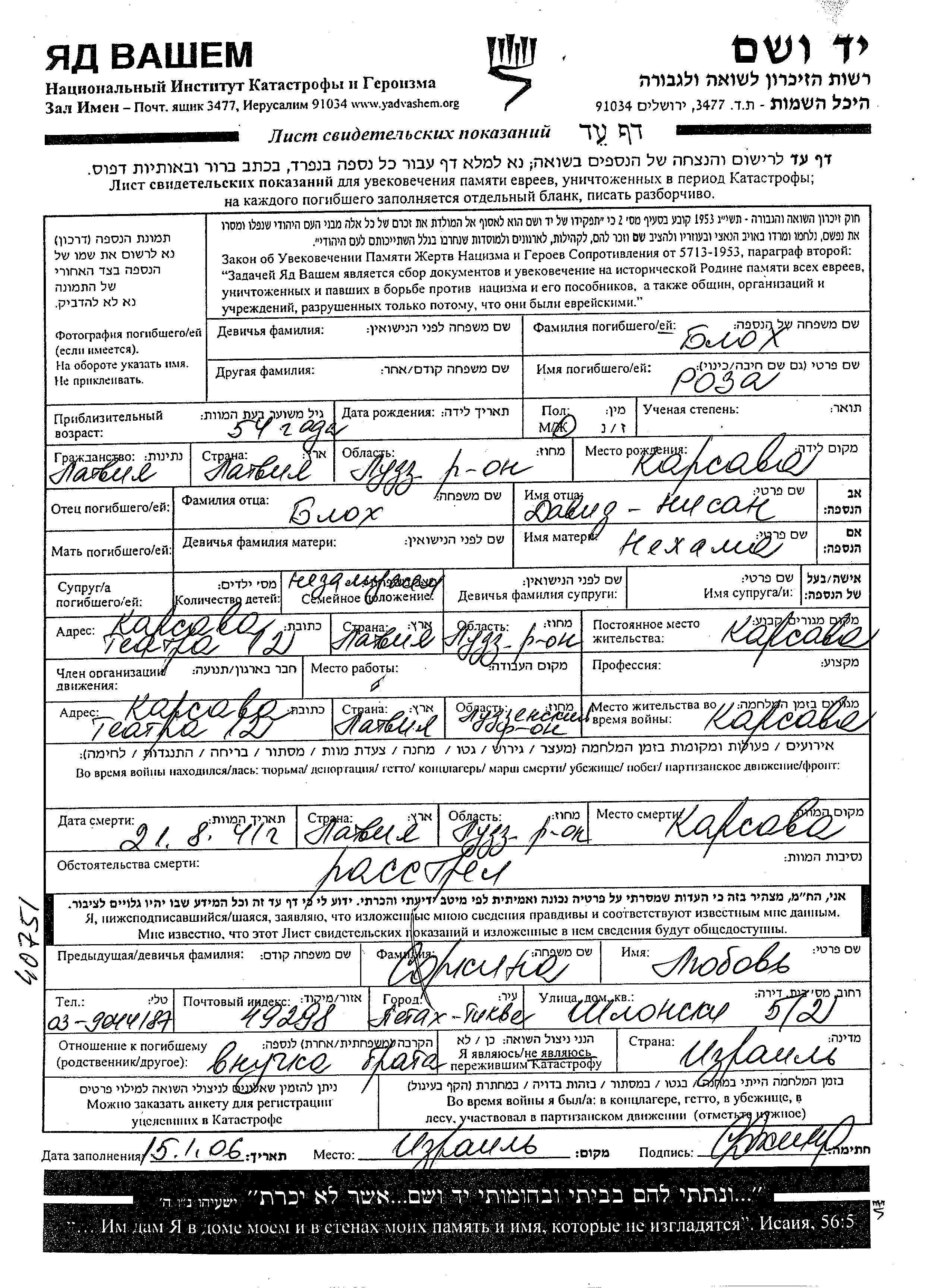 Яд Вашем - Листы свидетельских показаний Мемориального фонда