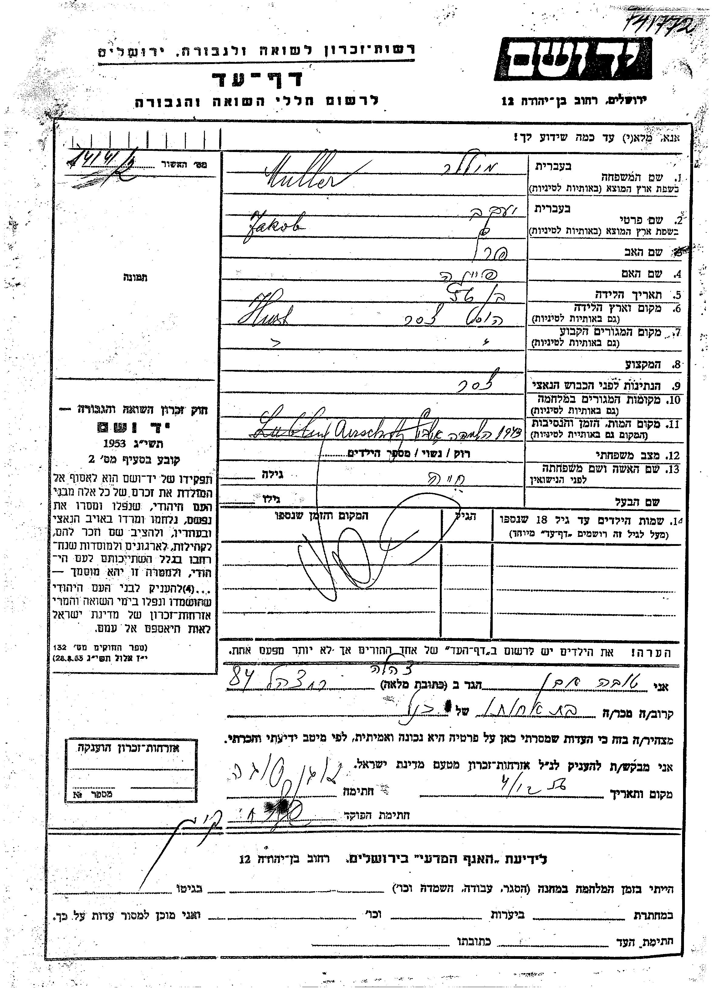Муллер Якоб 1885 Хуст, Чехословакия Лист свидетельских показаний