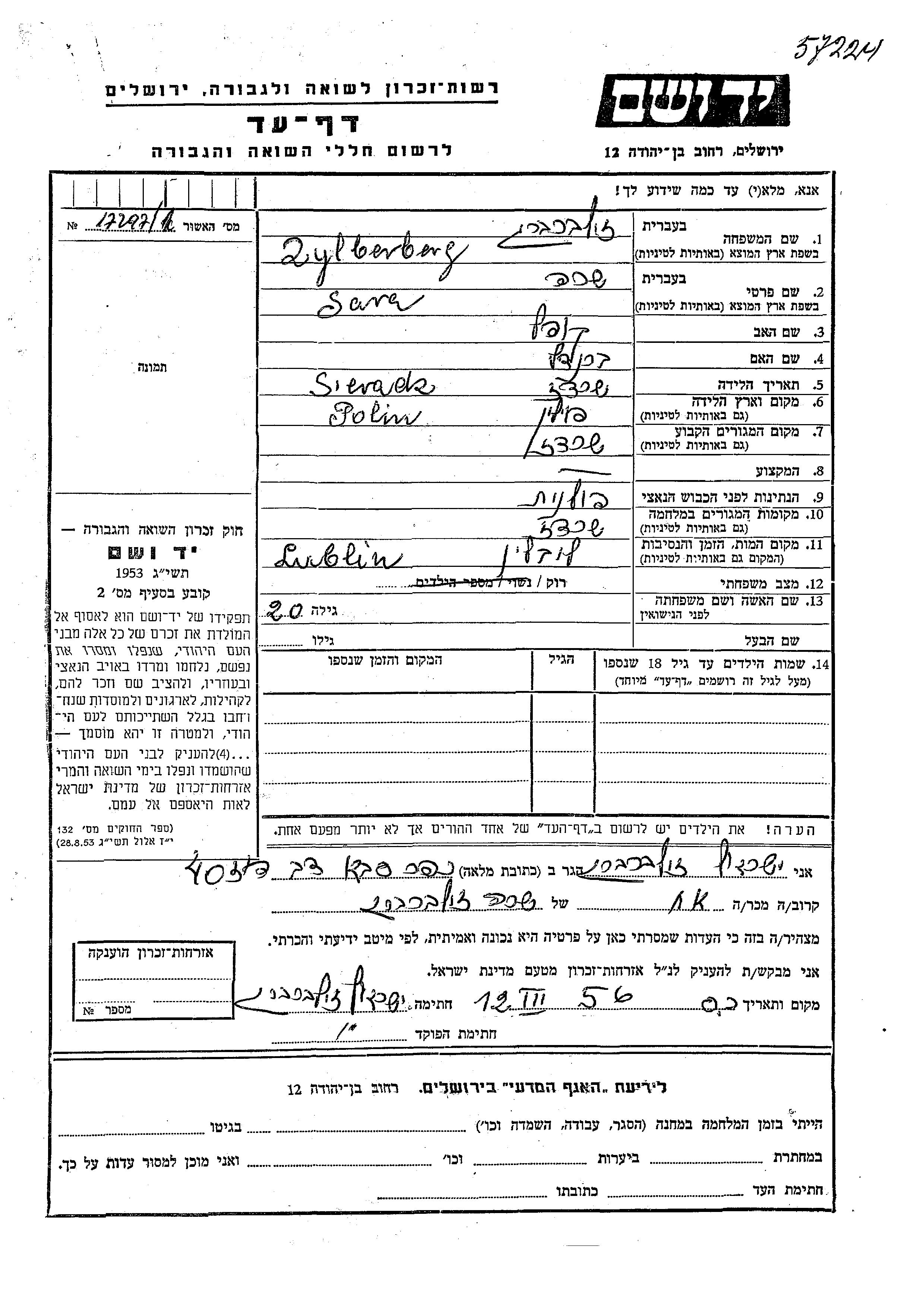 Зильберберг | Сара | Серадз, Польша | Лист свидетельских показаний | |