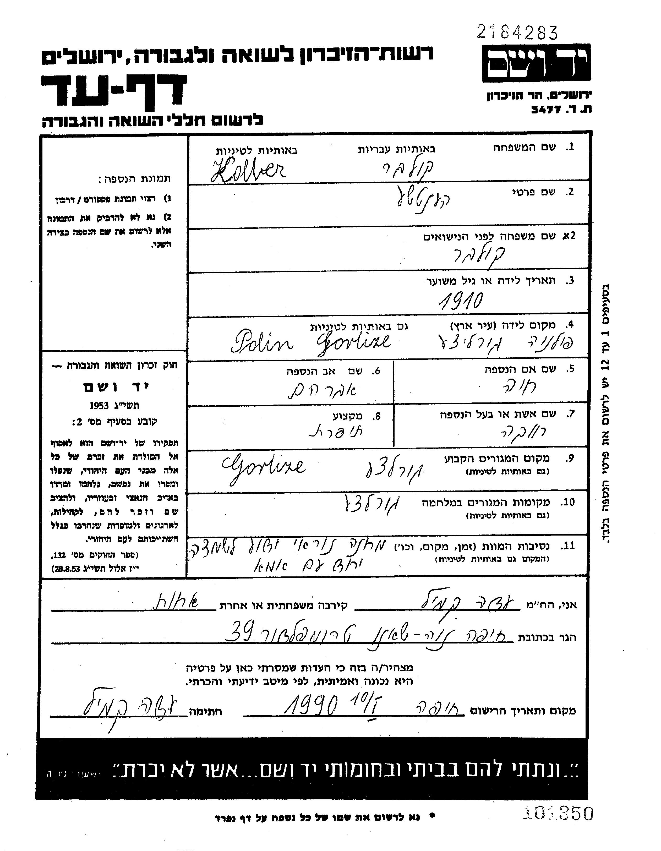 Яд Вашем - Листы свидетельских показаний Мемориального фонда