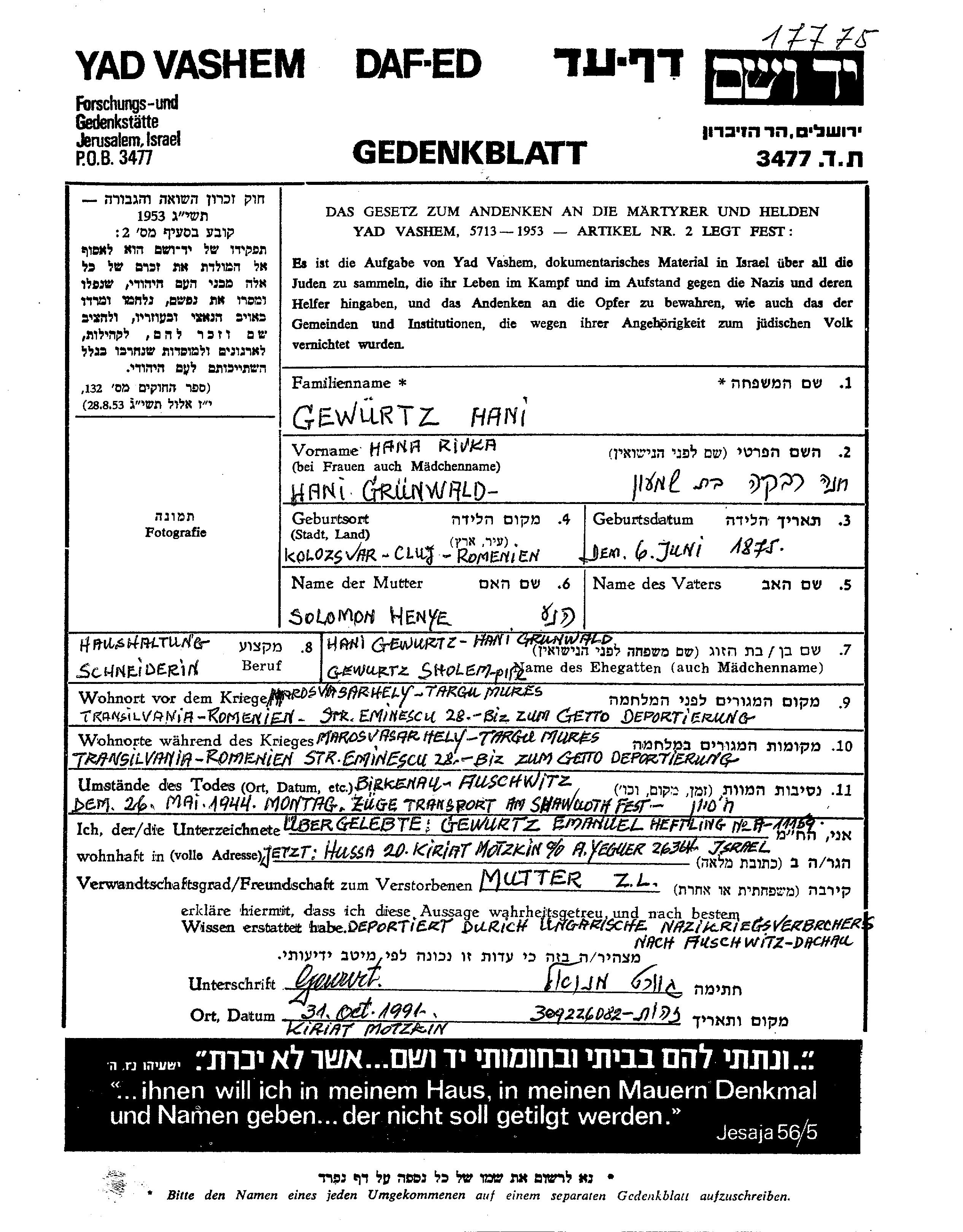 Ривка Йохана Хана Гевюрц, девичья фамилия Грюнвальд, место рождения: Клуж, Румыния. Место жительства до войны: Марошвашархей, Румыния.