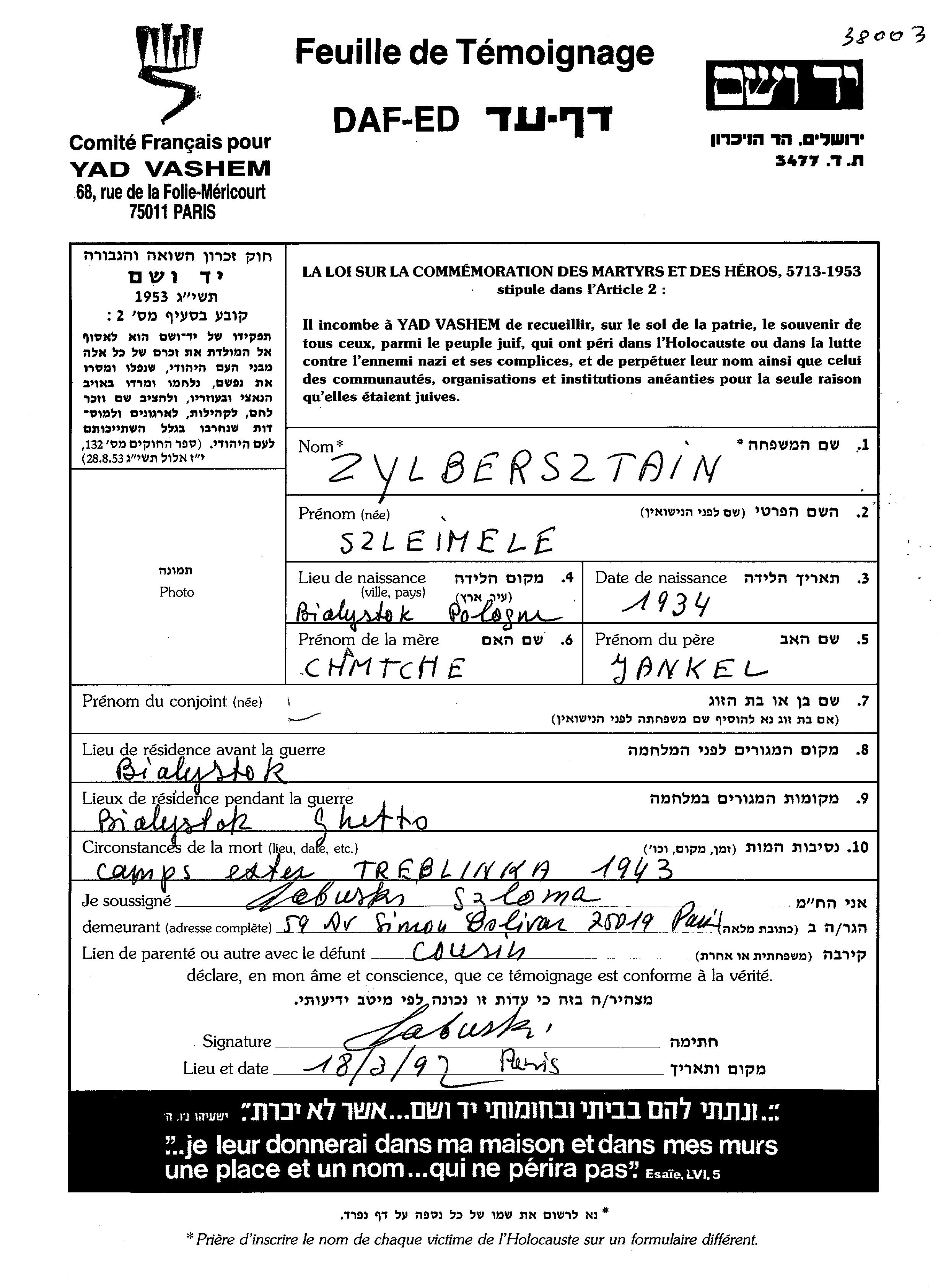 Зильберштейн Шлеймеле 1933 Белосток, Польша Лист свидетельских показаний