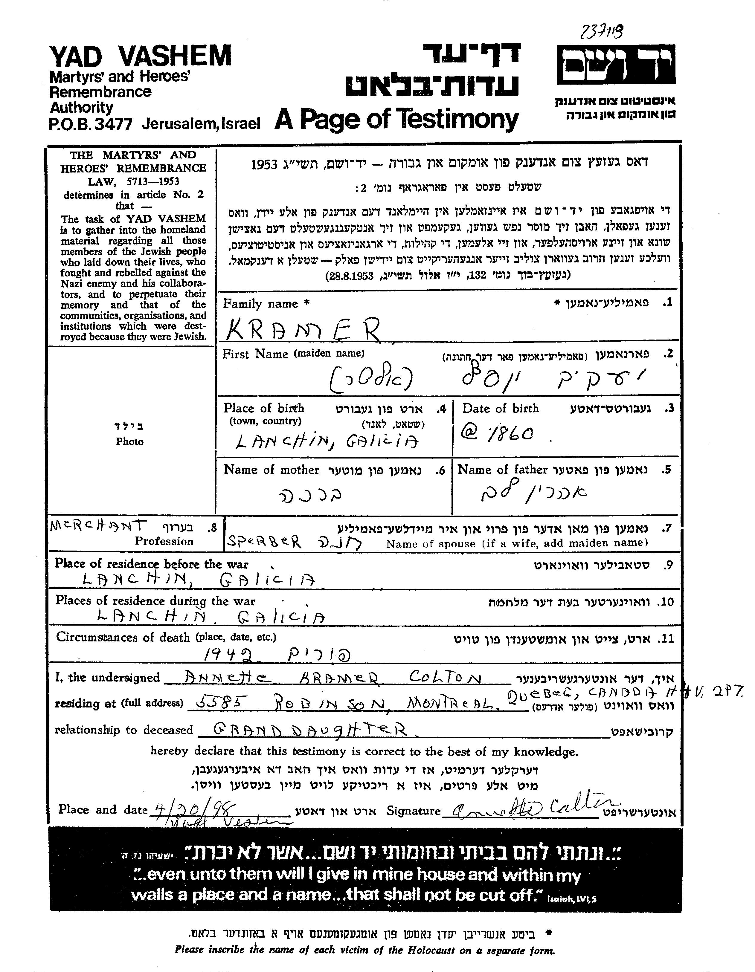Крамер | Яков Иосеф Алтер | 1860 | Ланчин, Польша | Лист свидетельских показаний |