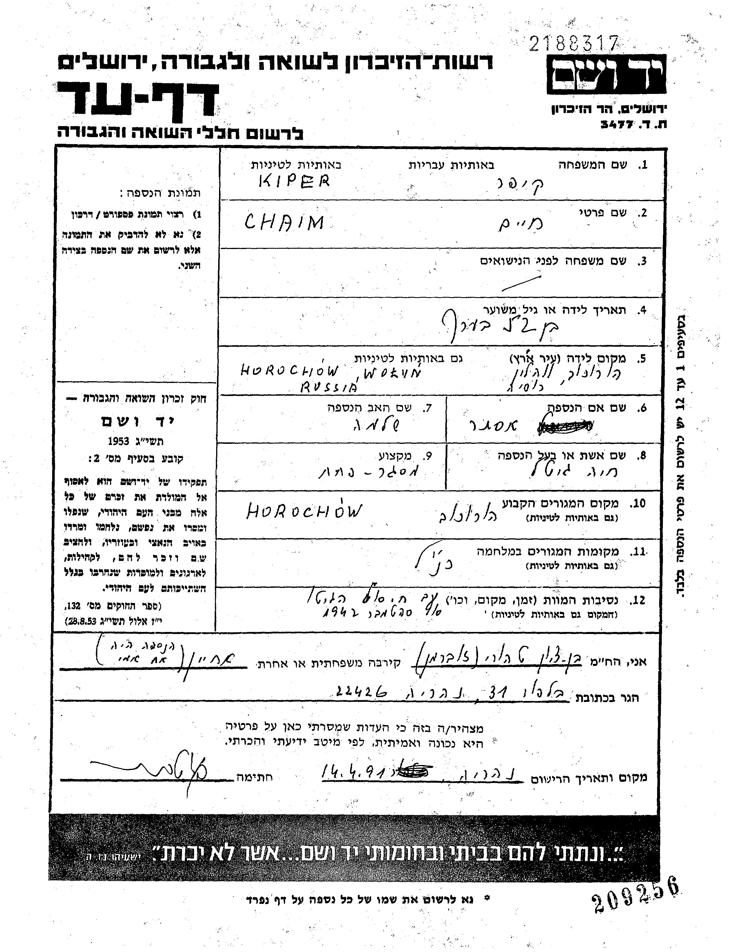 Хаим Кипер, место рождения: Горохов, Польша. Слесарь. Место жительства до войны: Горохов, Польша.