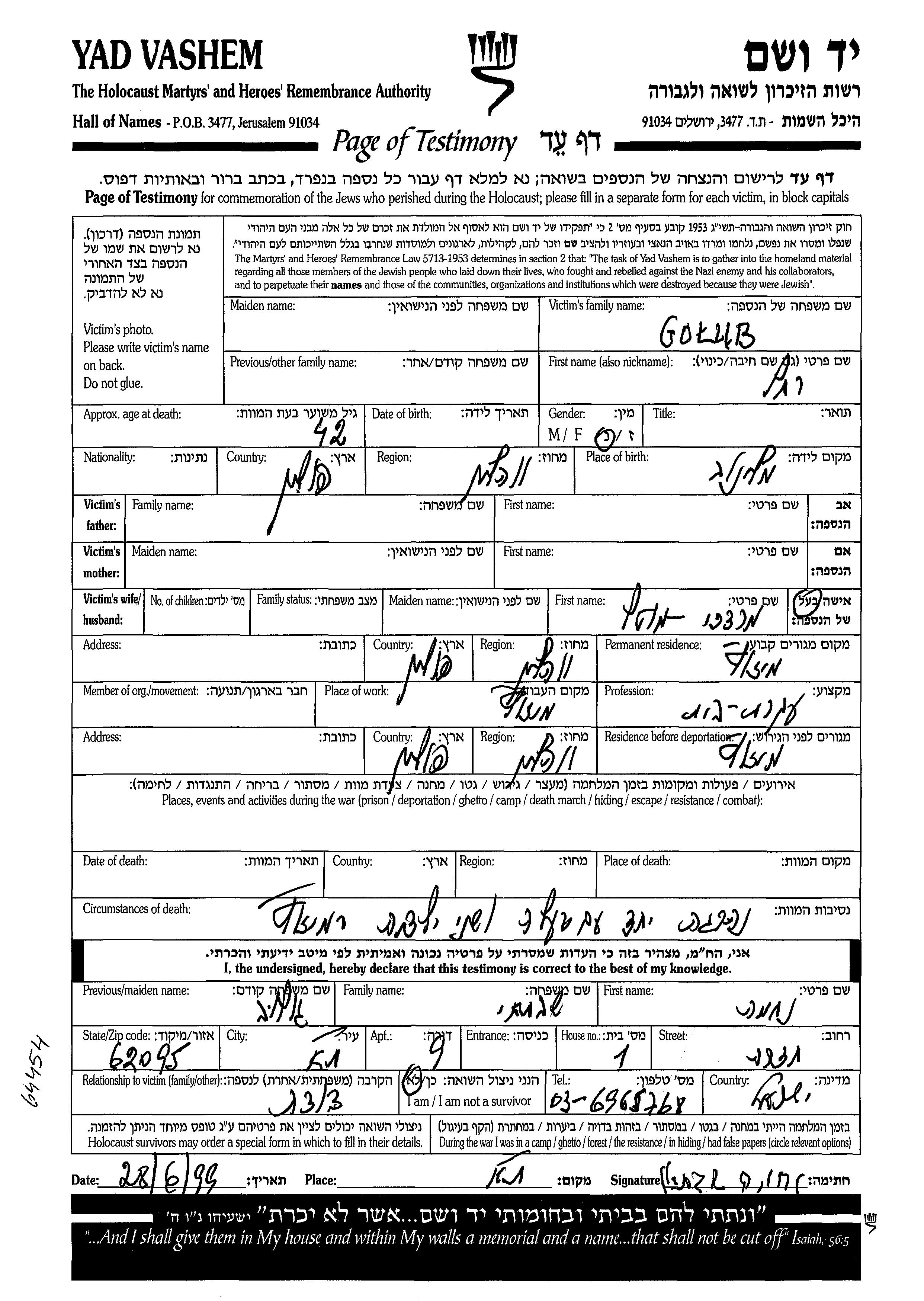 Голоб Рахель Мизоч, Польша Лист свидетельских показаний