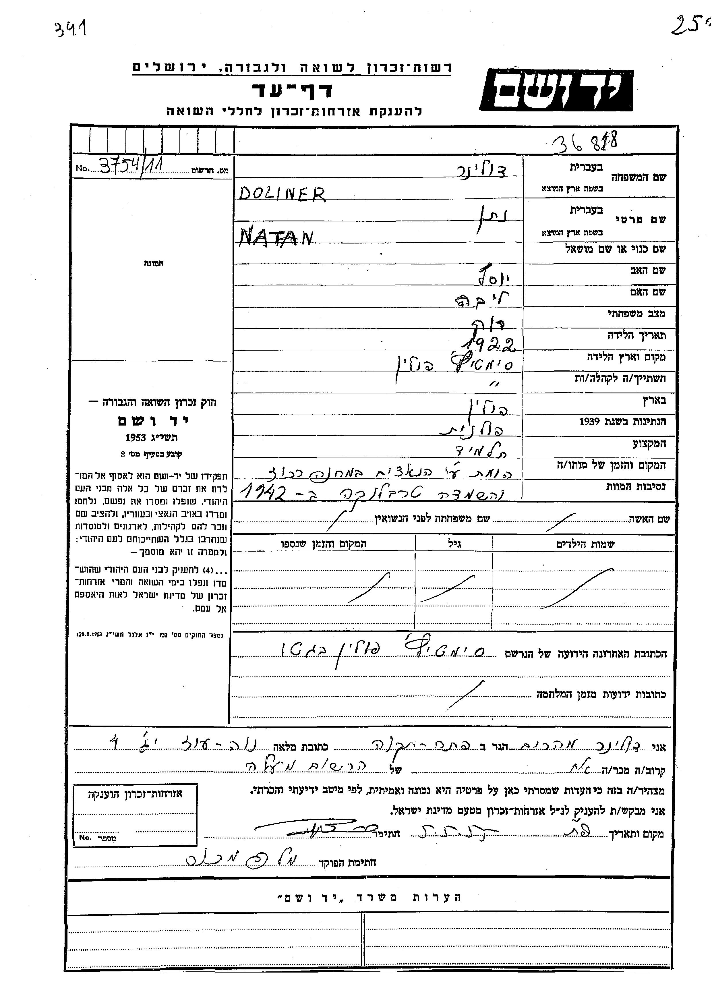 Натан Долинер, место рождения: Семятыче, Польша. Отец: Иосеф, mать:Либа. Ученик / ученица. Холост / не замужем. Место жительства до войны: Польша.