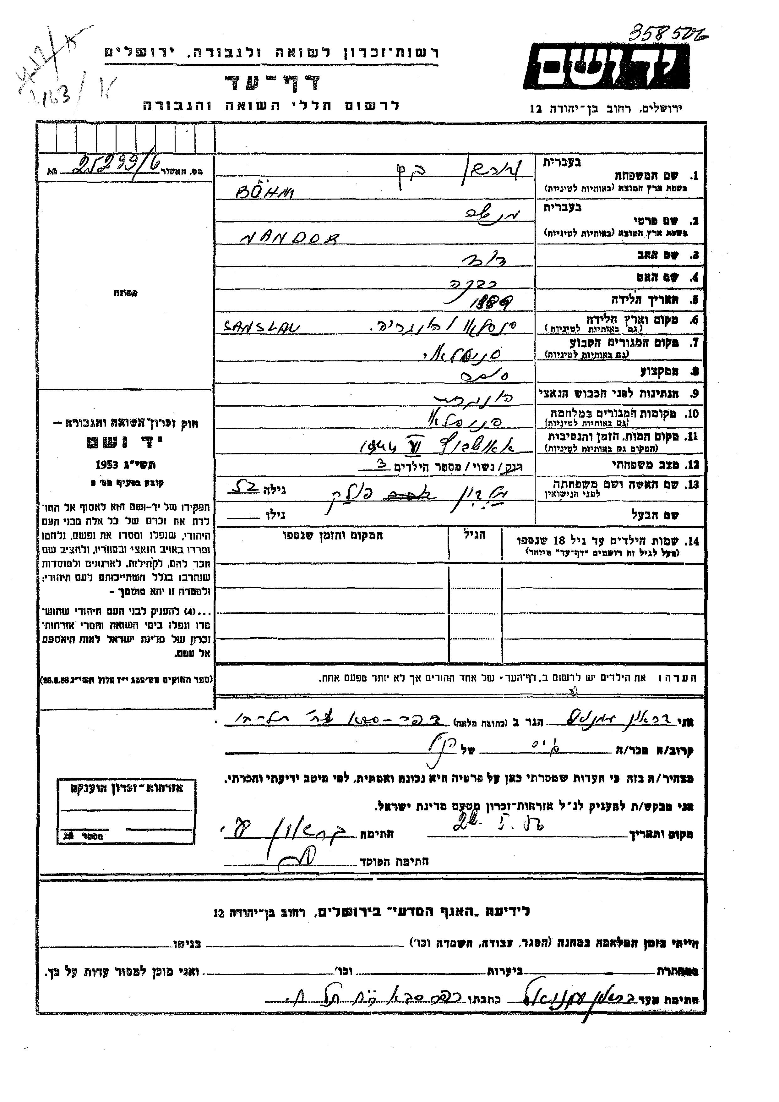 Бом | Нандор Менаше | 1889 | Санислэу, Румыния | Лист свидетельских показаний |