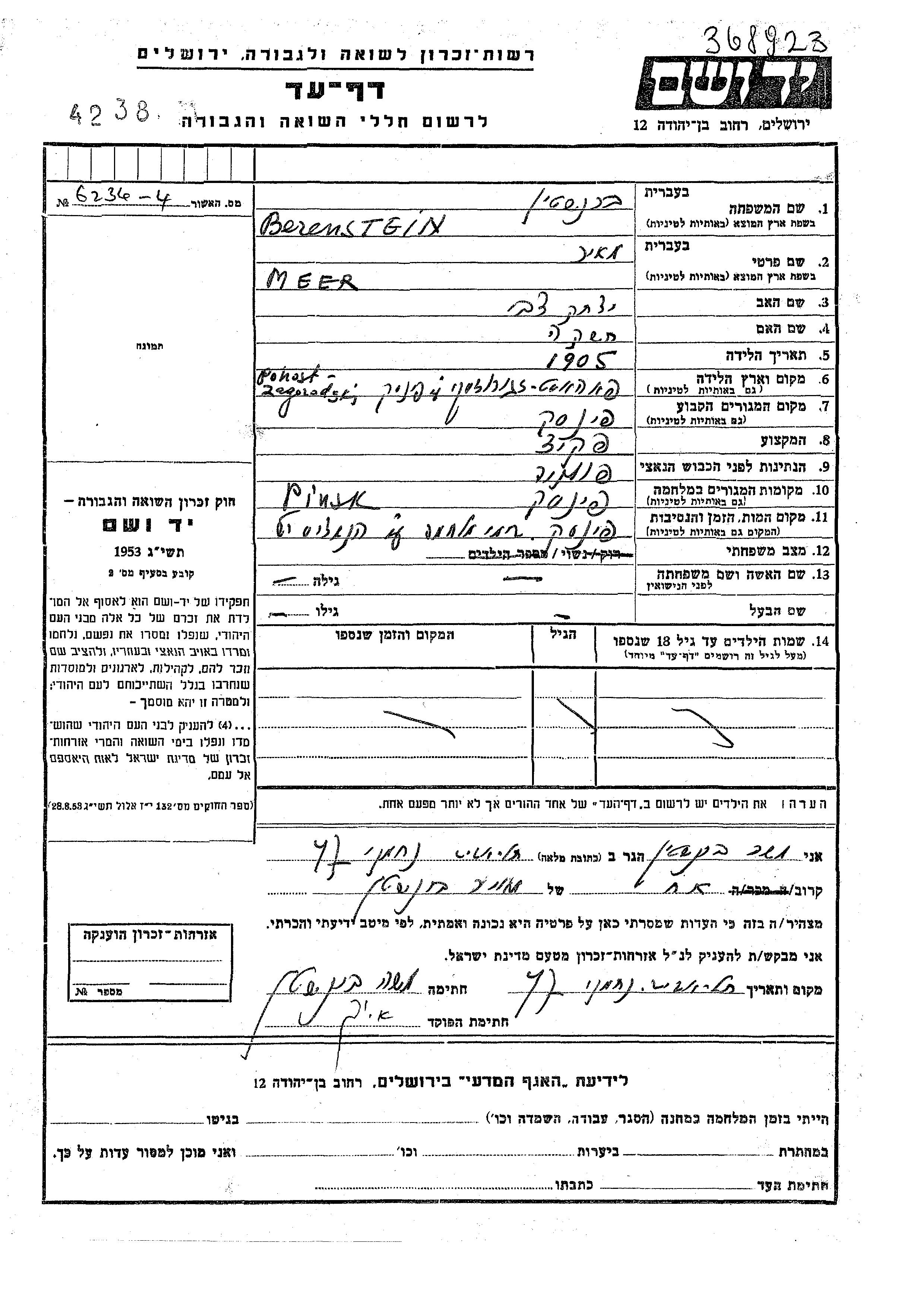 Меир Беренштайн, место рождения: Погост-Загородский, Польша. Клерк. Место жительства до войны: Пинск, Польша.