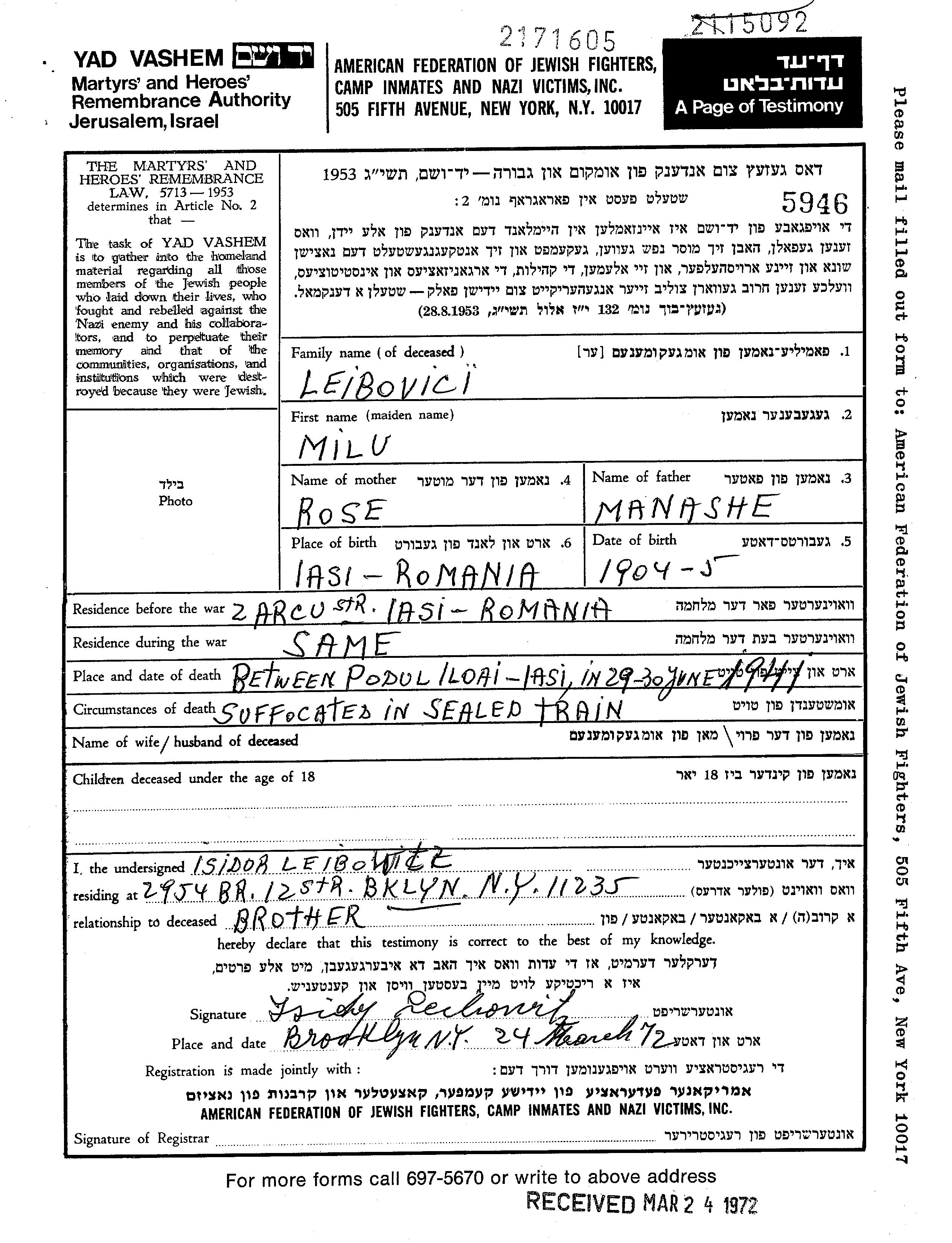 | Лейбович | Милу Мило | Яссы, Румыния | Лист свидетельских показаний | |