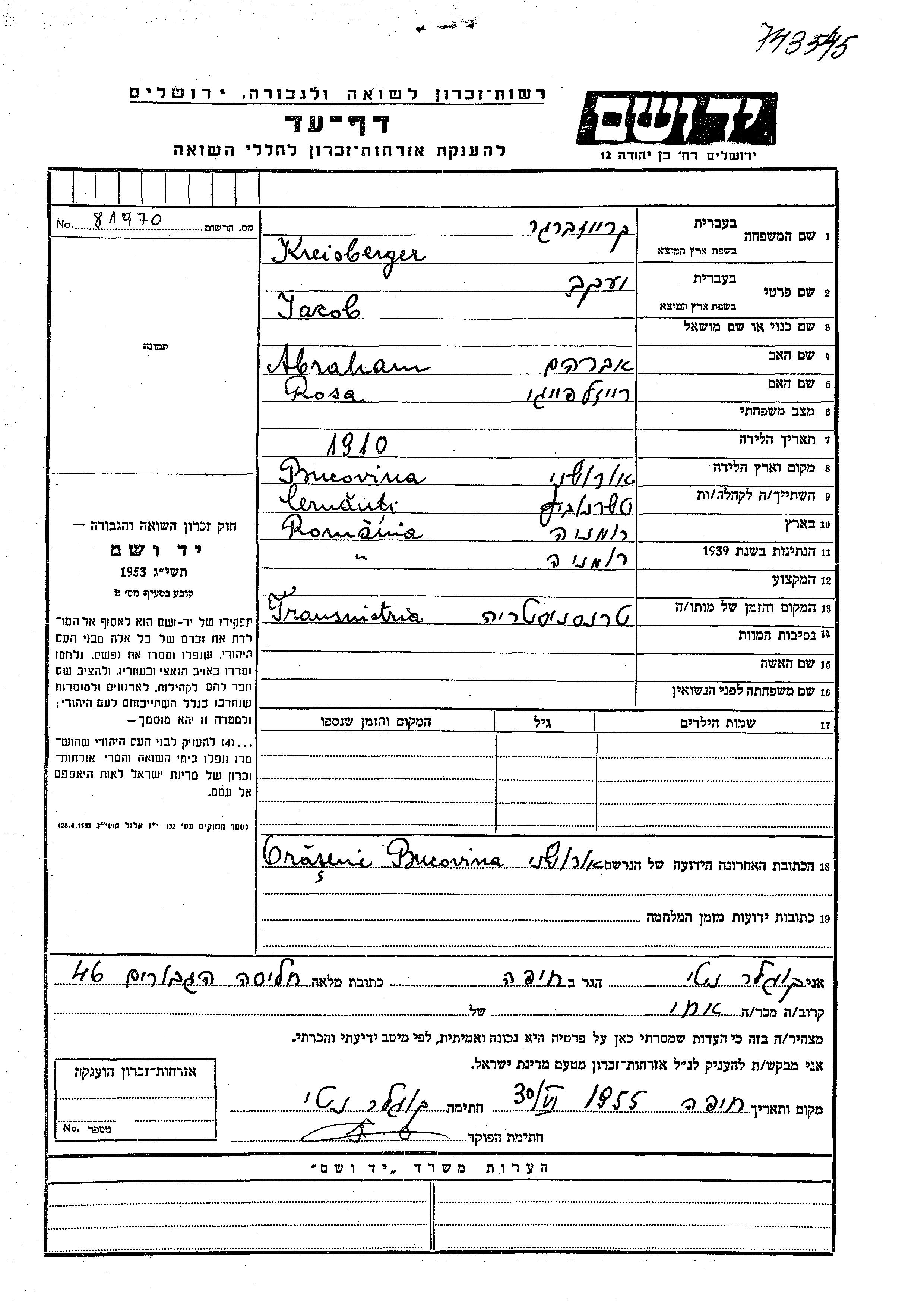 Крейзбергер Яков 1910 Орошаны, Румыния Лист свидетельских показаний