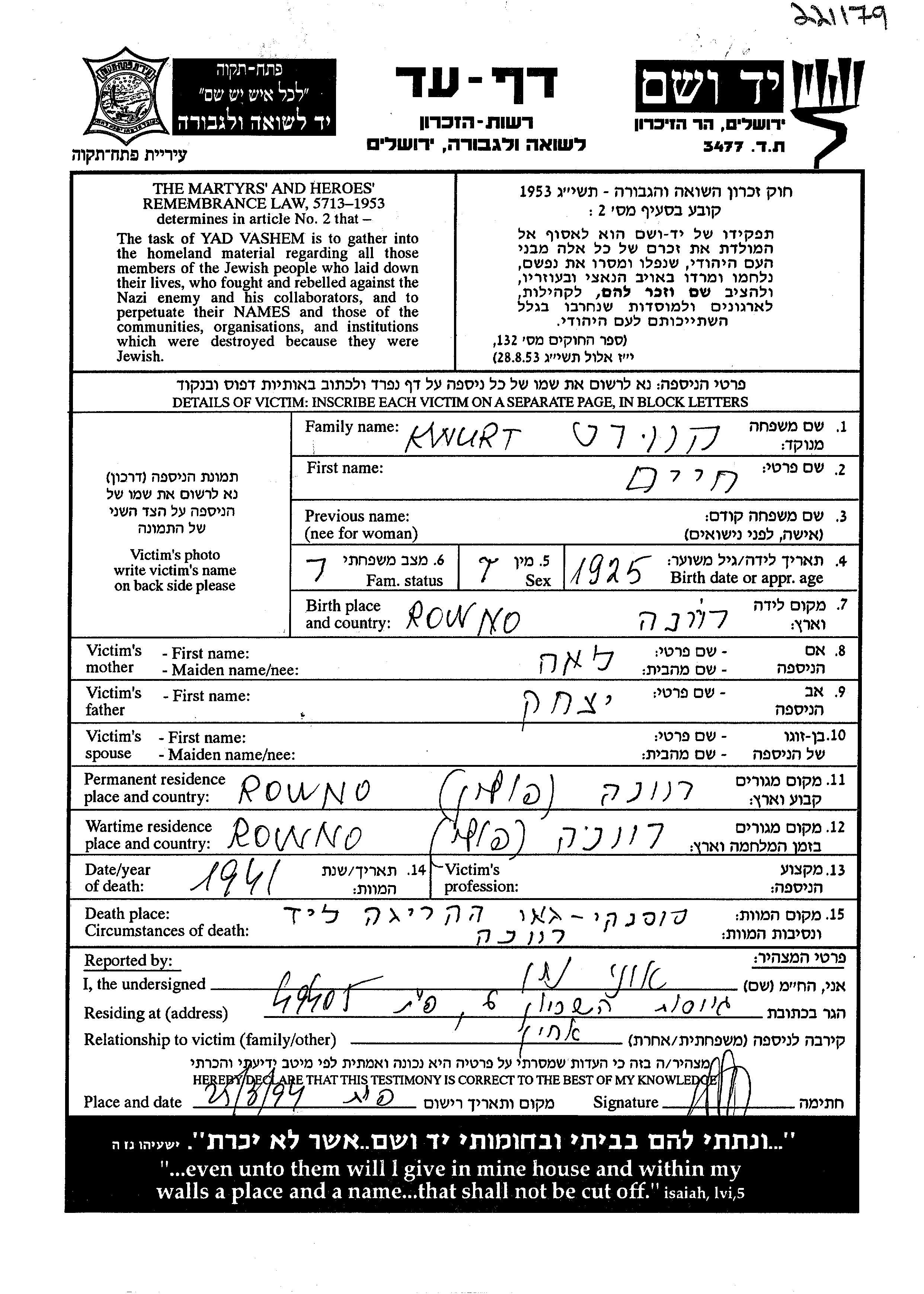 Квурт Каборт | Хаим | 1925 | Ровно, Польша | Лист свидетельских показаний |