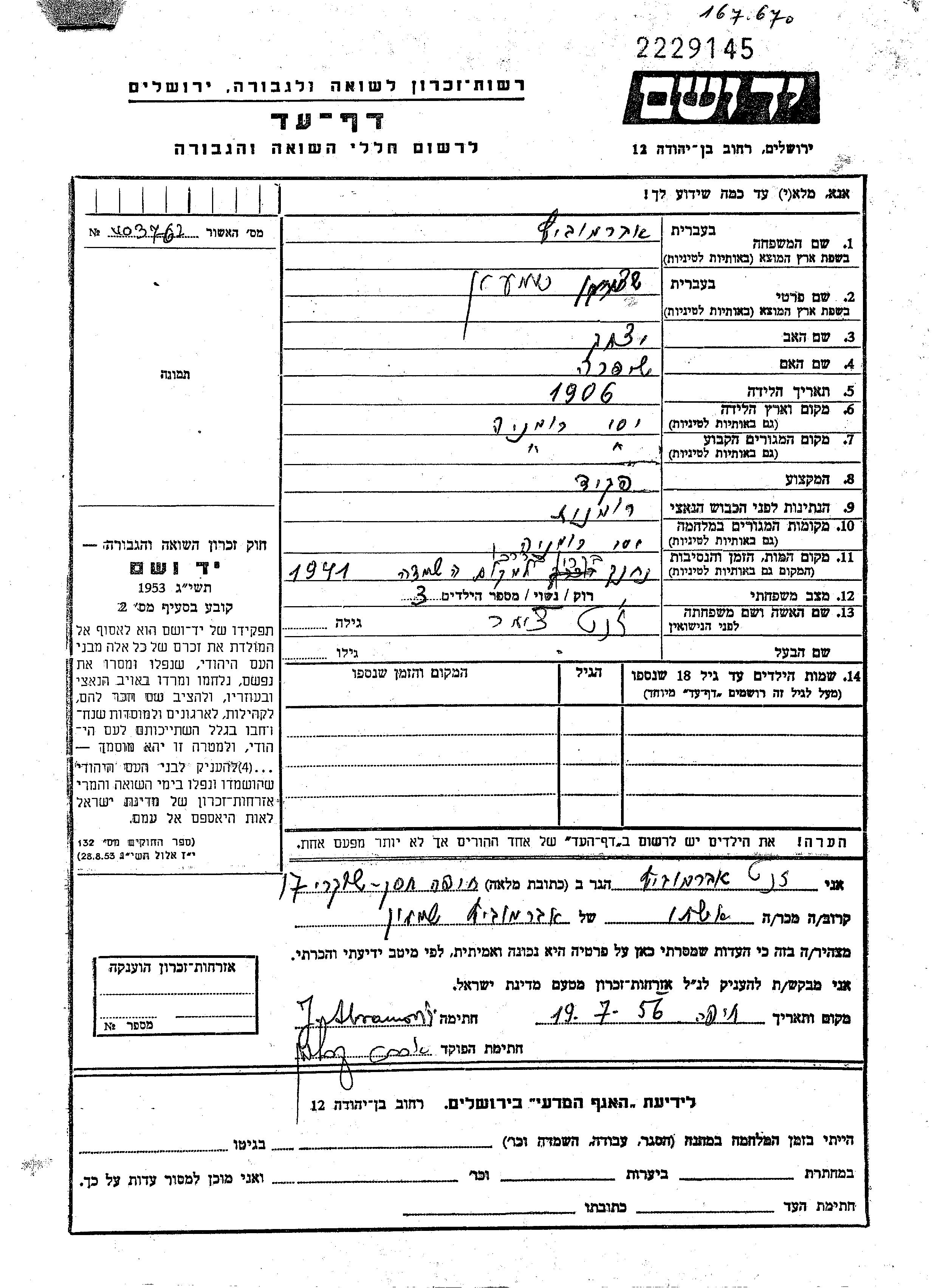 Яд Вашем - Листы свидетельских показаний Мемориального фонда
