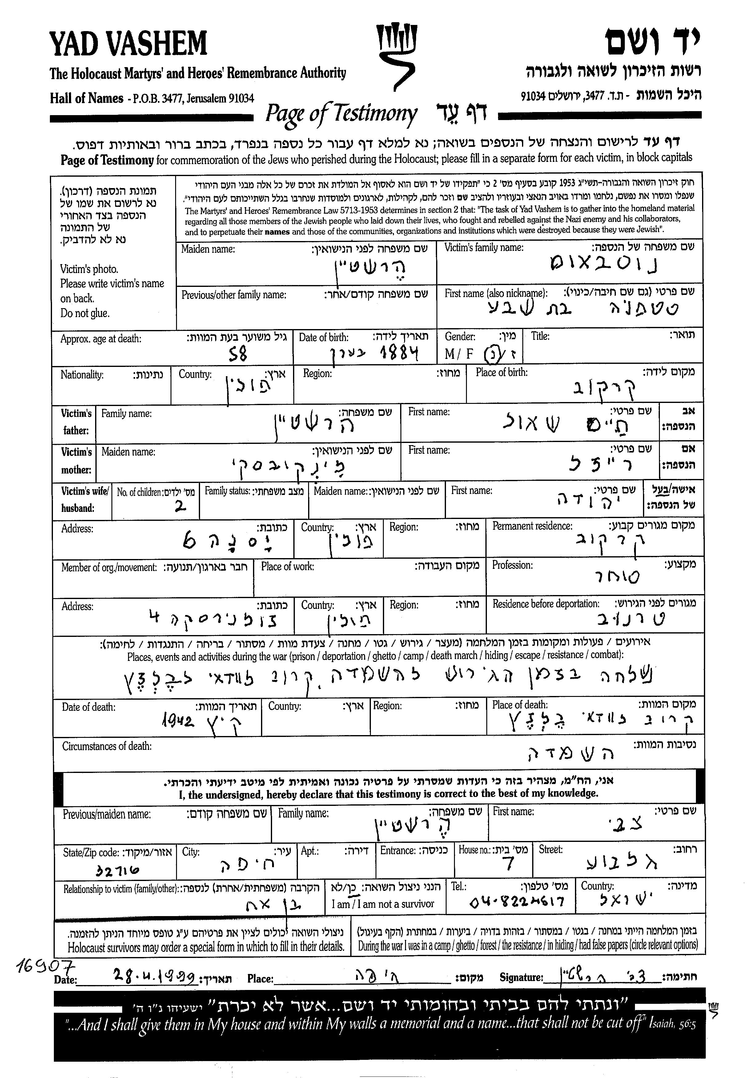 Нусбаум Стефания Батшева 1884 Краков, Польша Лист свидетельских показаний