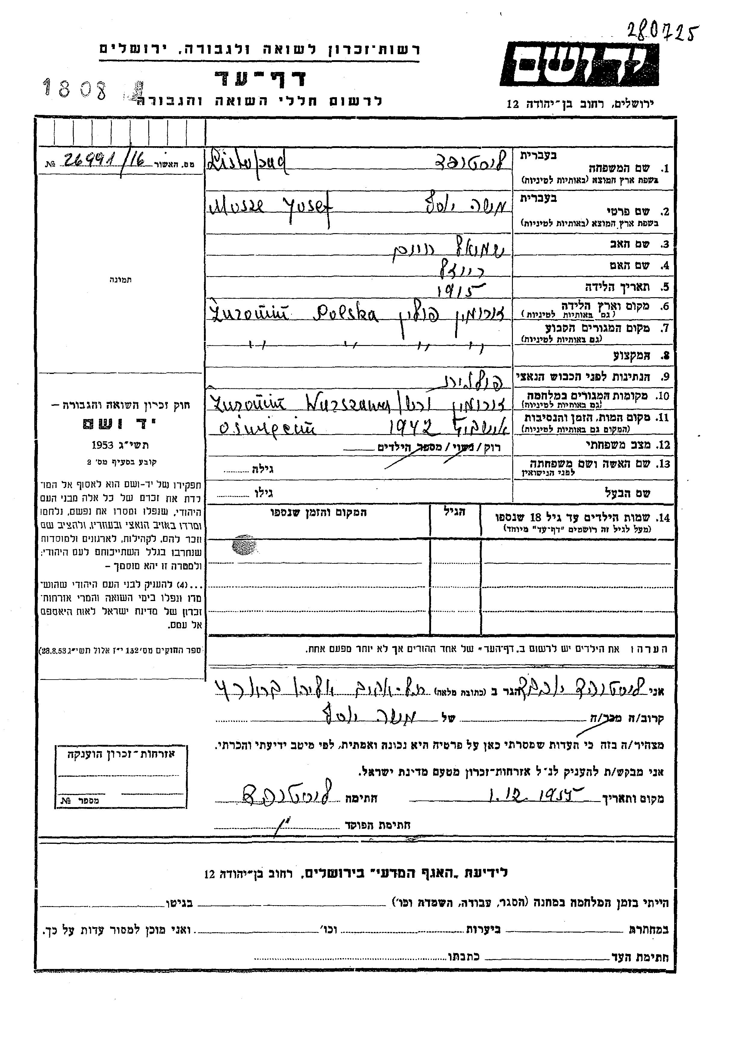Листопад Моше Иосеф 1915 Журомин, Польша Лист свидетельских показаний