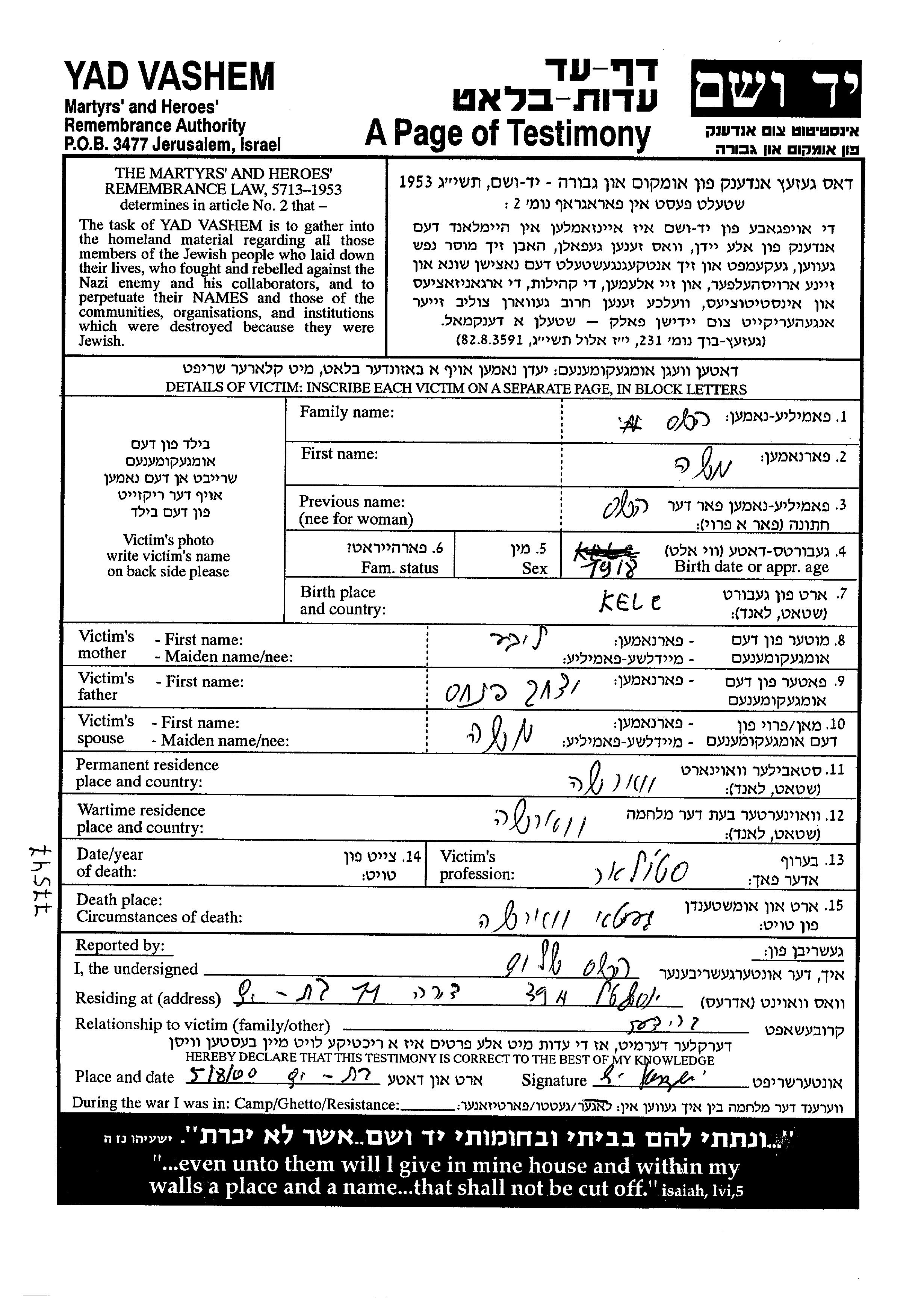 Хешес Моше Варшава, Польша Лист свидетельских показаний