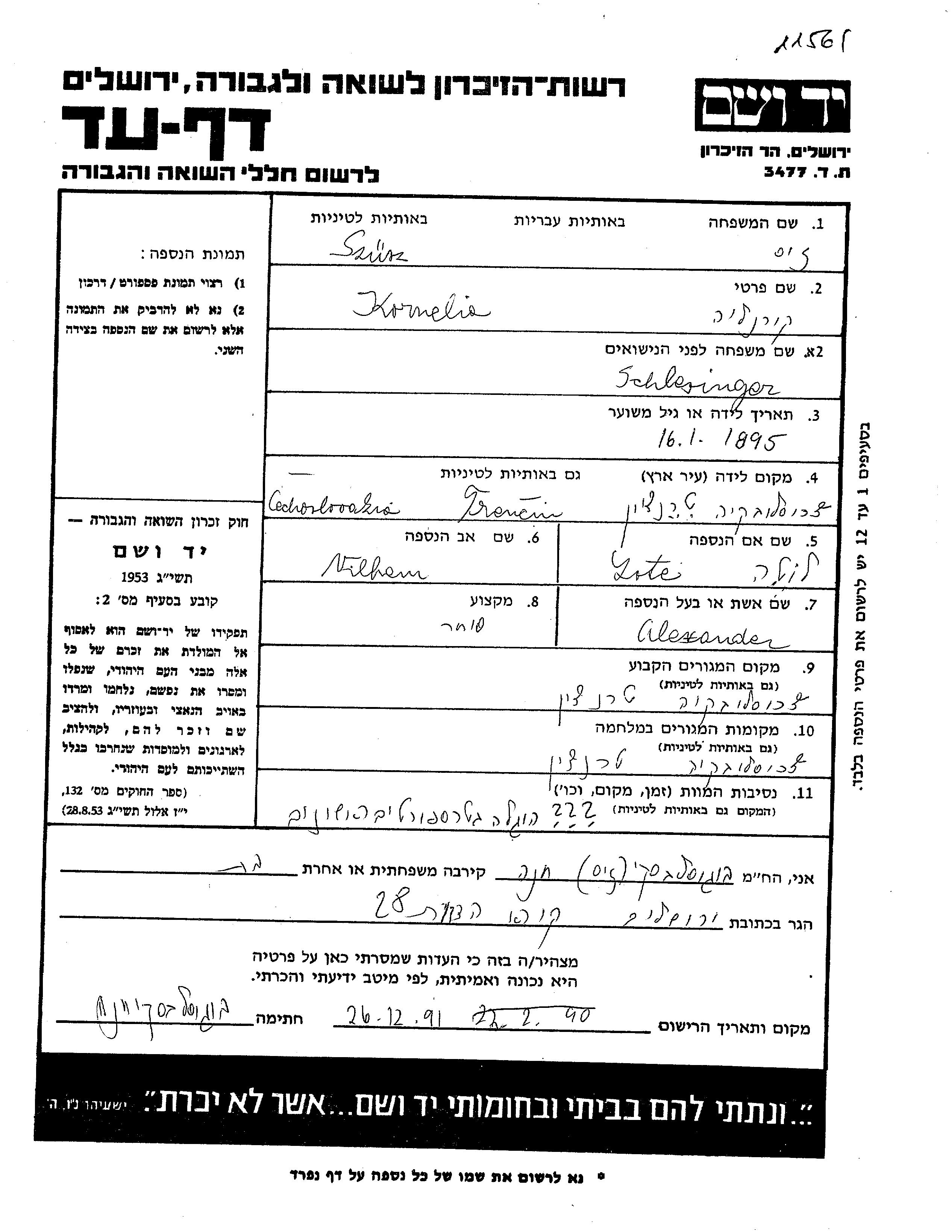 Сюс Корнелия 1895 Тренчин, Чехословакия Лист свидетельских показаний