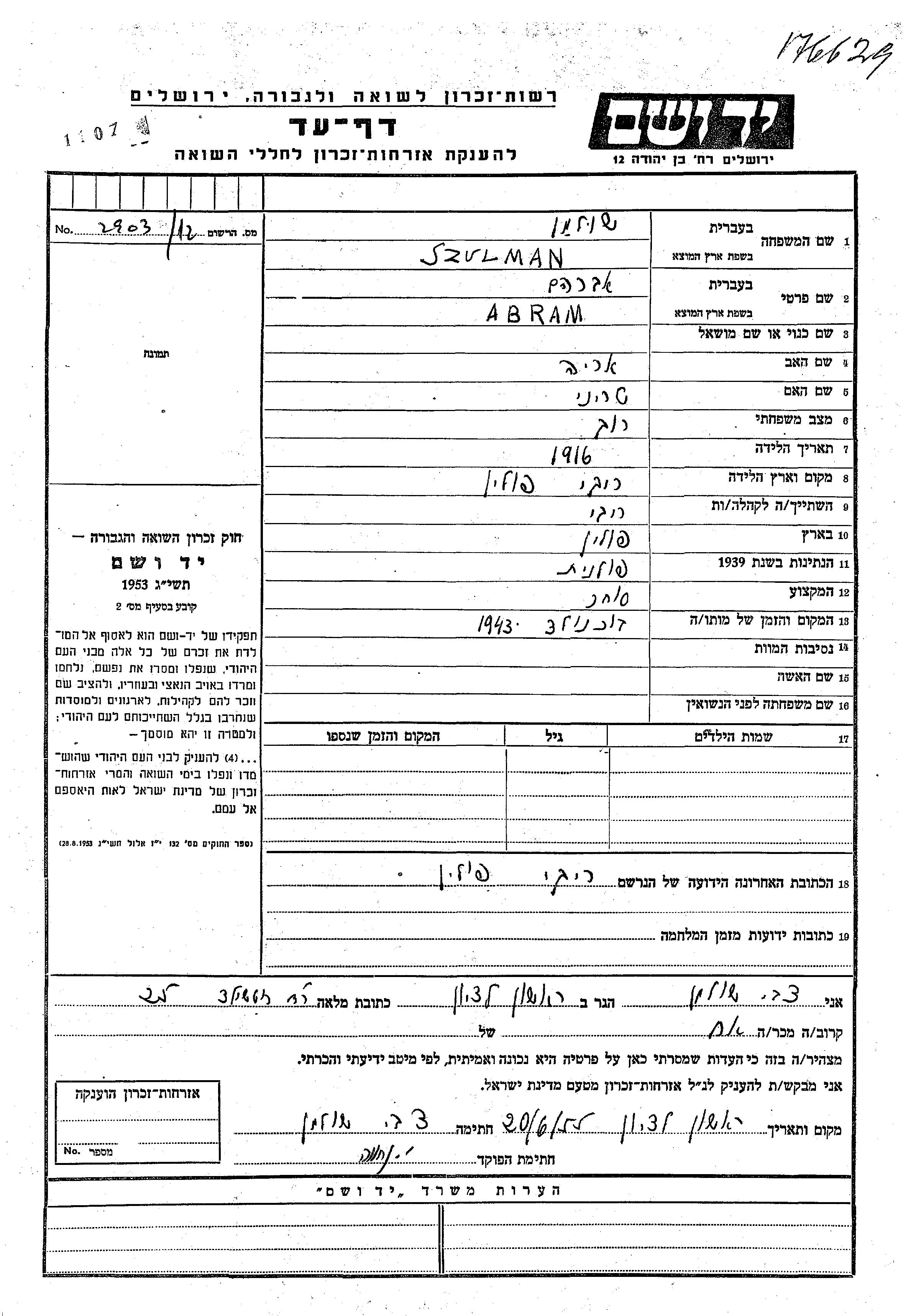 Абрам Шульман, место рождения: Рики, Польша. Отец: Арье, mать:Трини. Торговец / торговка. Холост / не замужем. Место жительства до войны: Рики, Польша. Место во время войны: Рики, Польша.