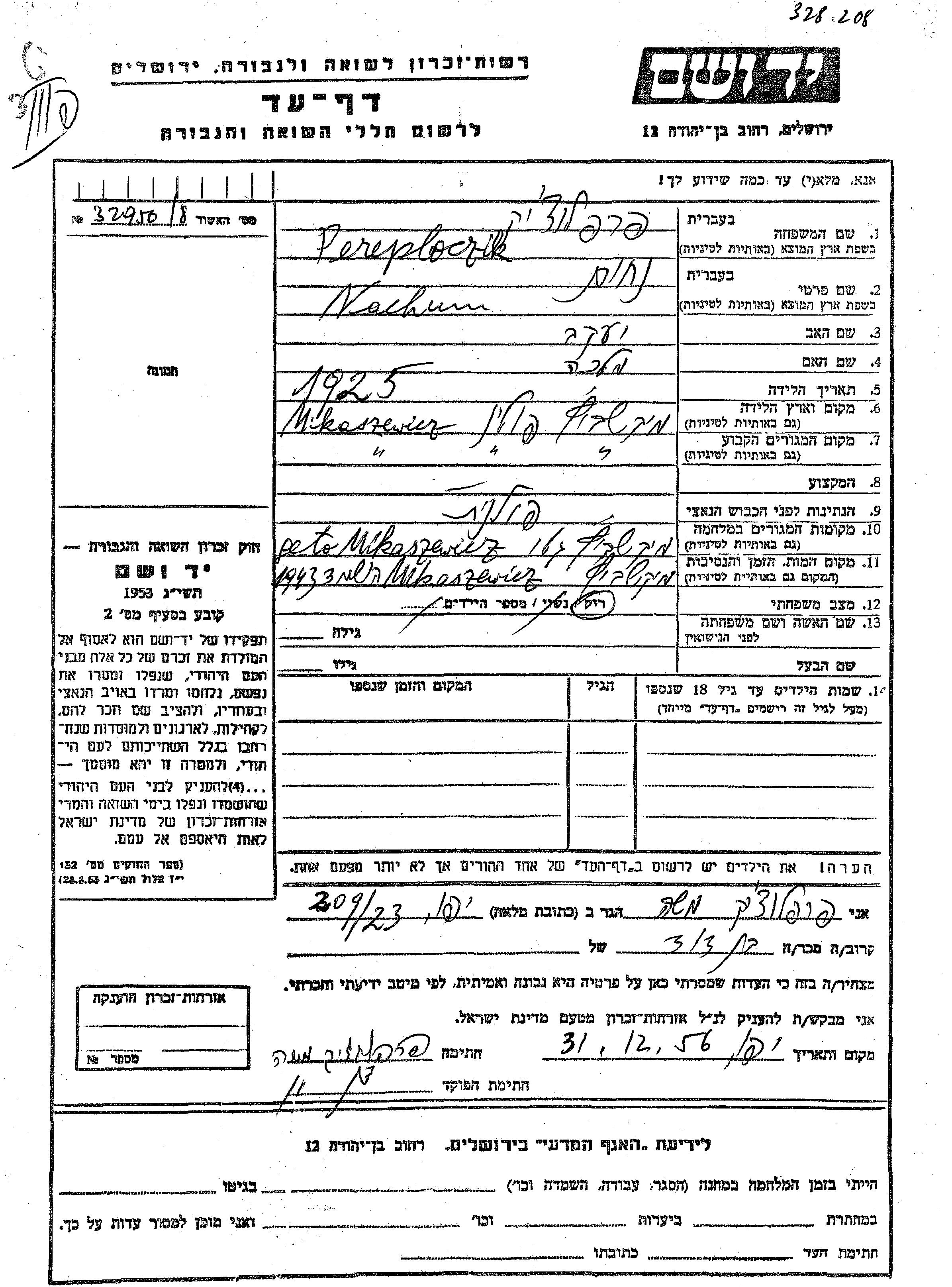 Нахум Переплёцик, место рождения: Микашевичи, Польша. Клерк. Место жительства до войны: Микашевичи, Польша.