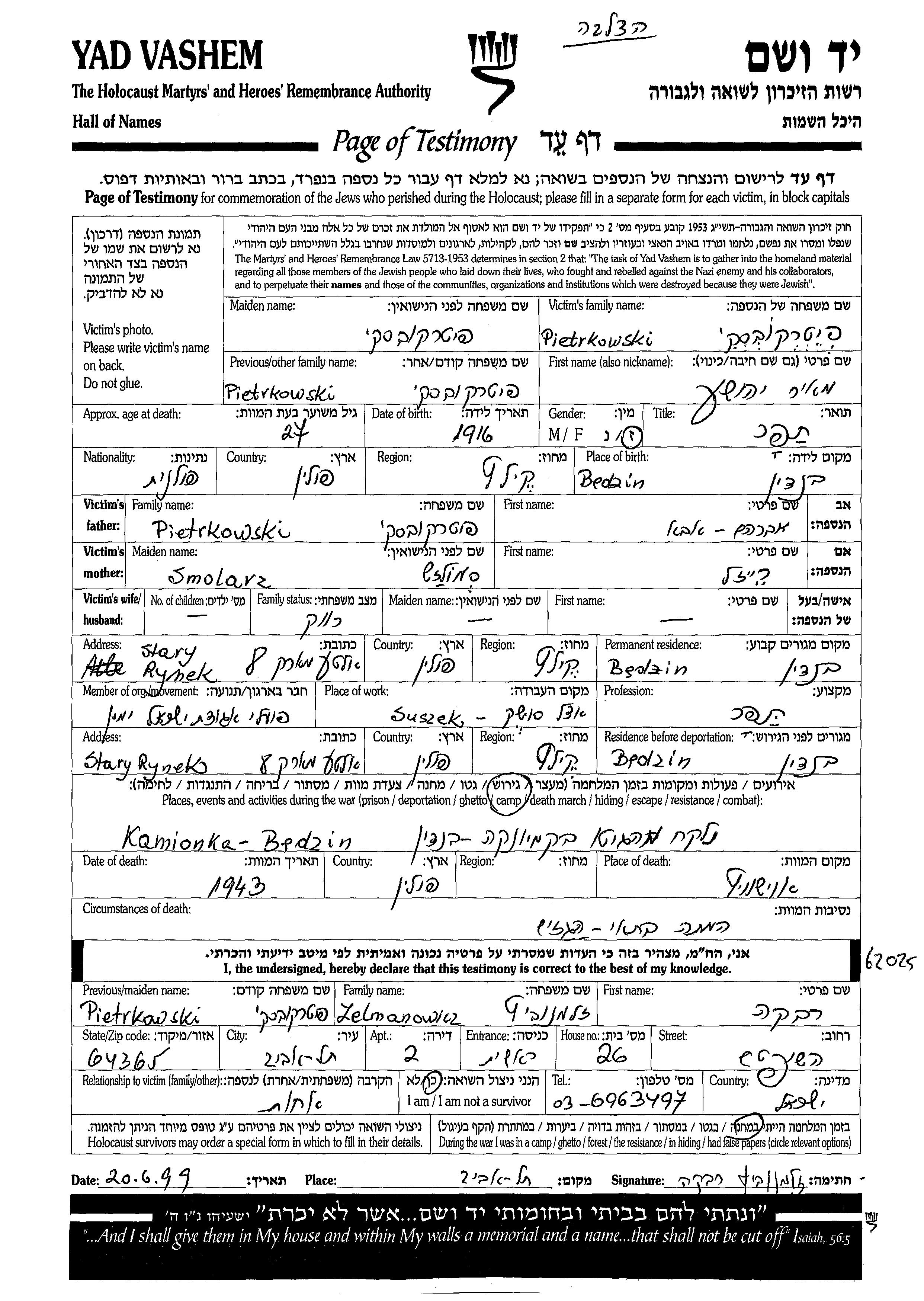 Петрковски | Меир | 1916 | Бендзин, Польша | Лист свидетельских показаний |