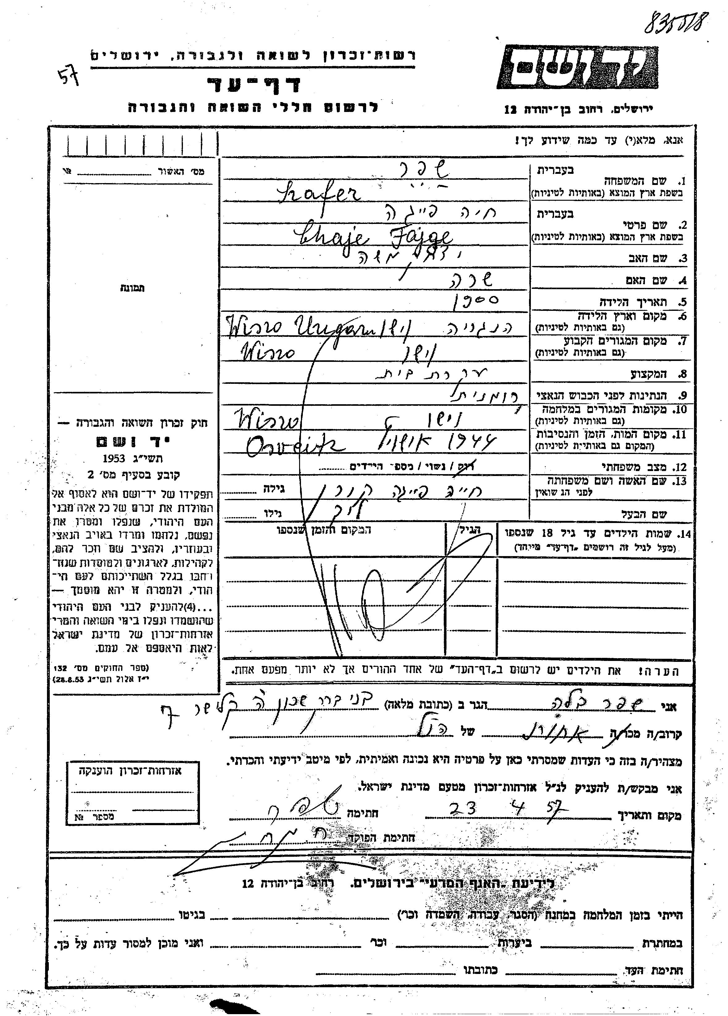 Шафер | Хае Файге | 1900 | Вишо, Румыния | Лист свидетельских показаний |