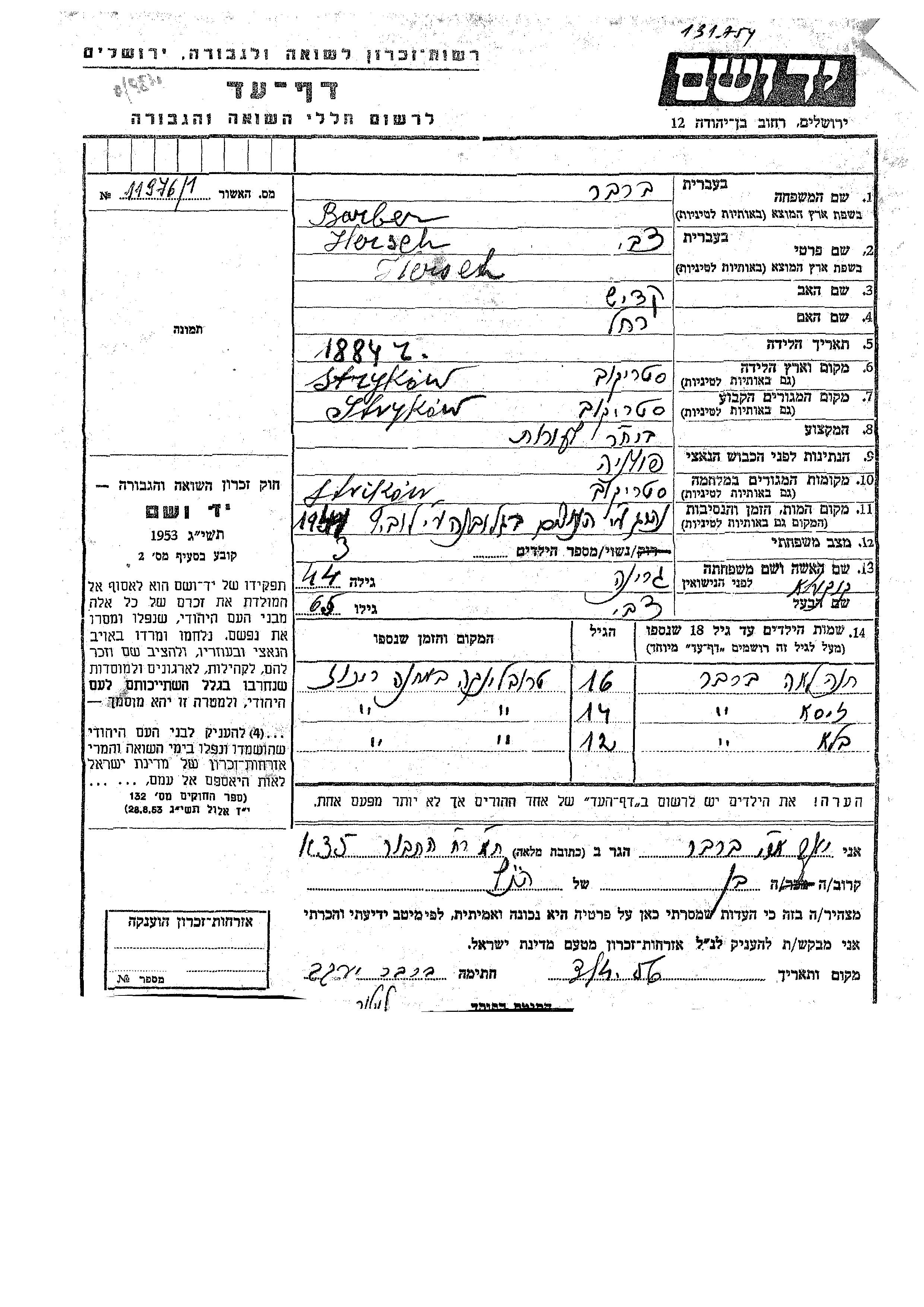 Герш Цви Барбер, место рождения: Стрыкув, Польша. Торговец / торговка. Место жительства до войны: Стрыкув, Польша.