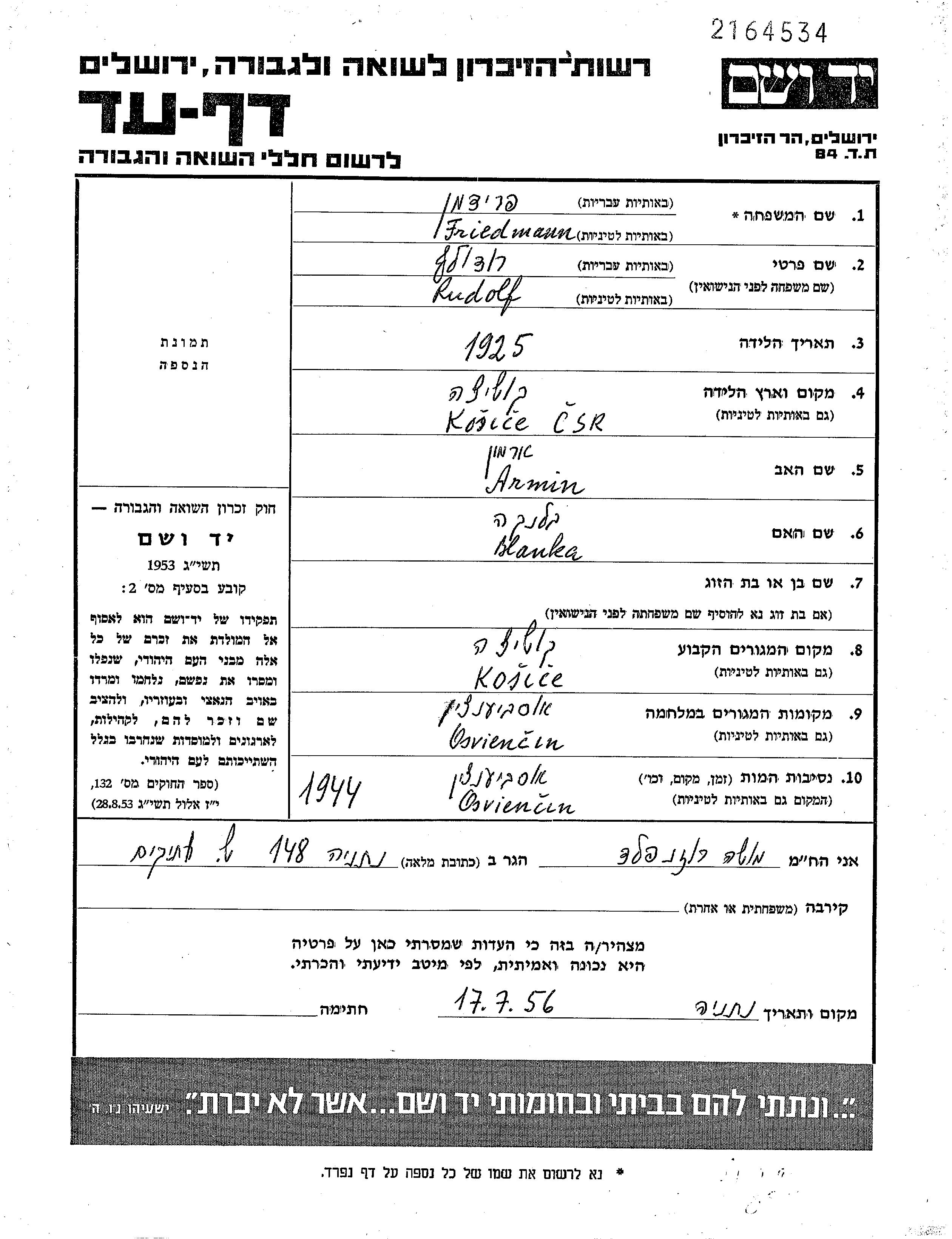 Рудольф Фридман, место рождения: Кошице, Чехословакия. Место жительства до войны: Кошице, Чехословакия.