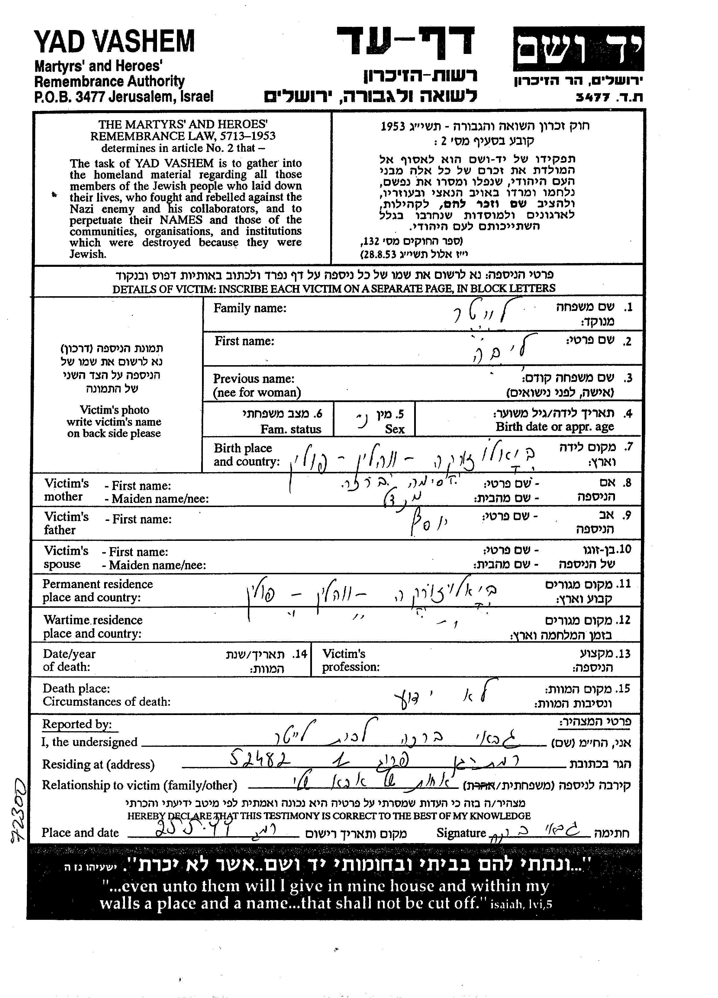 Яд Вашем - Листы свидетельских показаний Мемориального фонда
